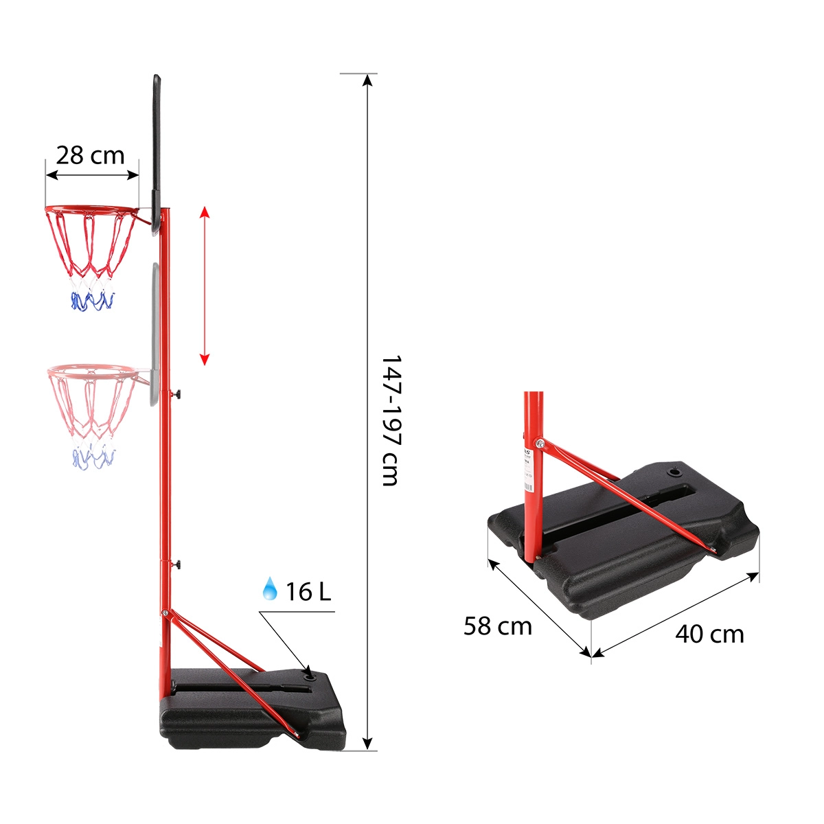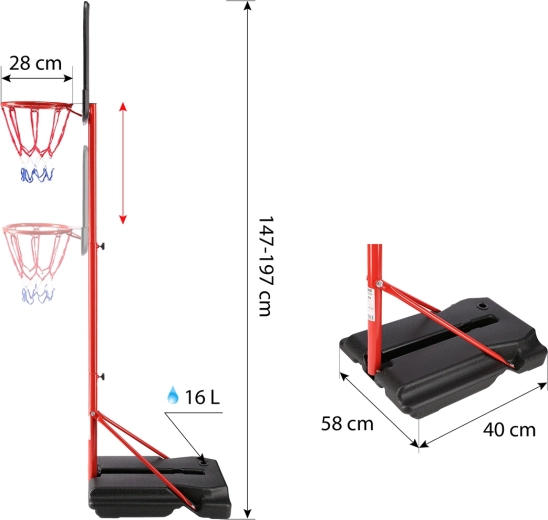 - Nastavljiv po višini – konstrukcija 1,47 ali 1,97 m; obroč na višini 1,07 ali 1,57 m