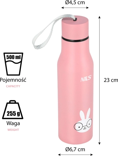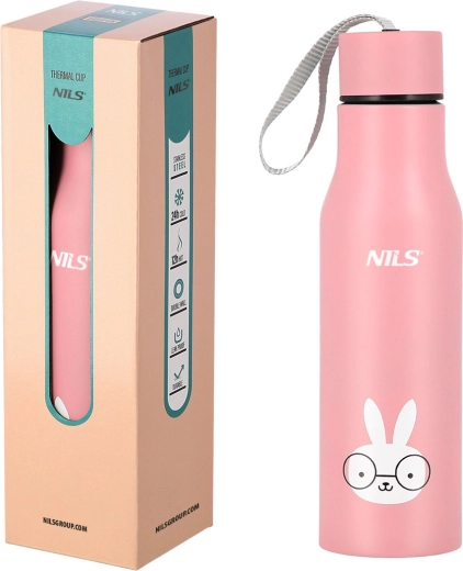 Slogovita termenska steklenica NILS Camp z motivom zajčka izstopa po preprosti zasnovi in izvirnem dizajnu. Zahvaljujoč dvojni steni iz nerjavnega jekla ohrani tople napitke do 12 ur in hladne do 24 ur. Praktičen navojni pokrov preprečuje uhajanje tekočine, prostornina 500 ml pa je idealna za pisarno, šolo in izlete.