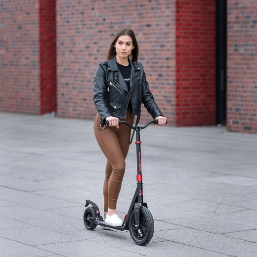 Okvir iz aluminija in jekla ohranja nizko težo in visoko vzdržljivost. Gumijasti ročaji nudijo zanesljiv oprijem, krmilo je mogoče višinsko nastaviti 98–115 cm in ga rahlo pomakniti naprej za boljši nadzor. Aluminijasti zadnji blatnik deluje kot učinkovita zavora za hitro in varno upočasnitev, praktično stojalo pa olajša parkiranje.