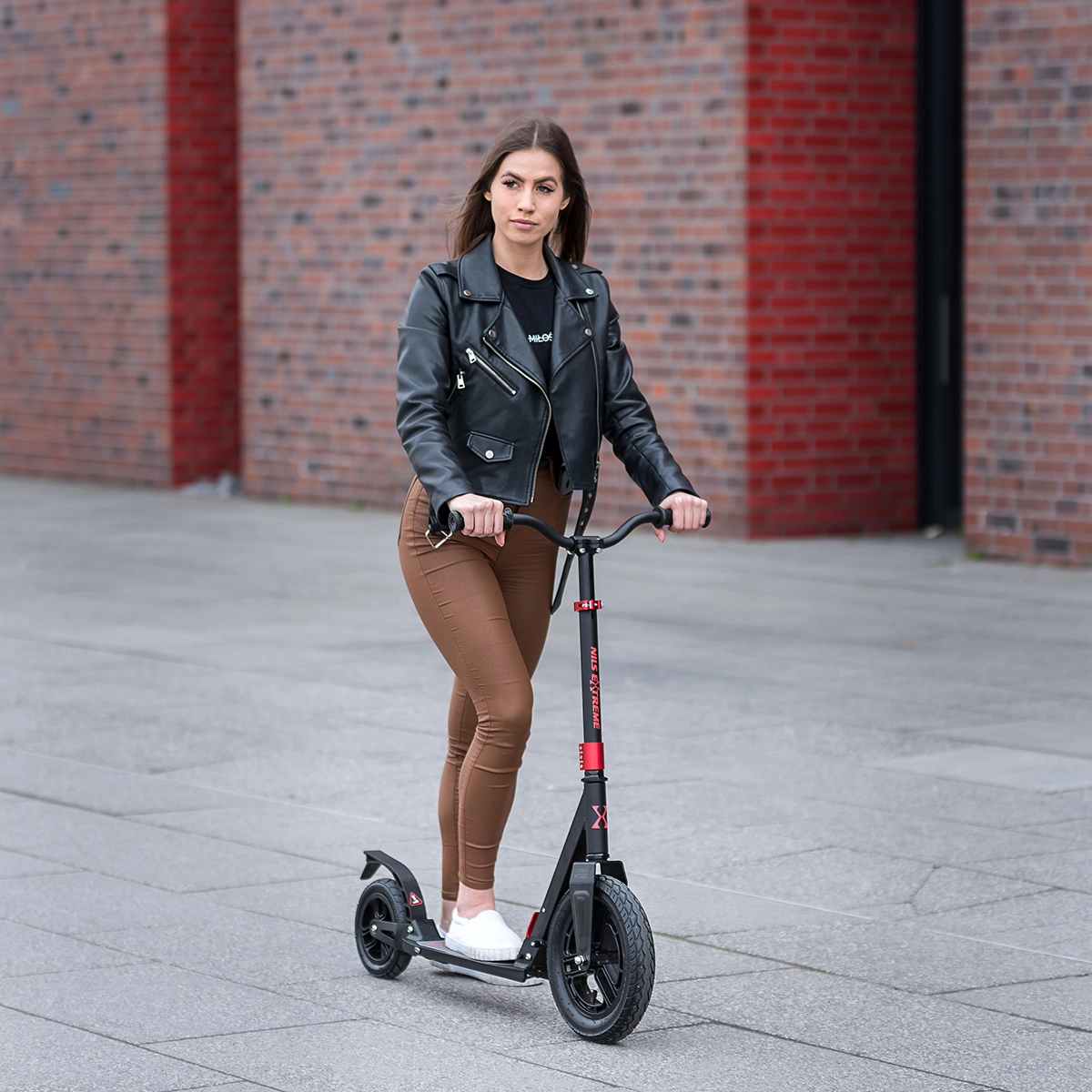 NILS Extreme HC300 je premišljeno zasnovan mestni skiro za odrasle, ki se zlahka spopade s tlakovci, robniki in razpokami v asfaltu. Veliko pnevmatsko sprednje kolo 300 mm in zadnje 200 mm v kombinaciji z vzmetenjem blažita neravnine in zagotavljata stabilnost tudi na daljših poteh. Zložljiv mehanizem omogoča hitro zlaganje krmila in skiroja za enostavno prenašanje v javnem prevozu ali shranjevanje v prtljažniku.