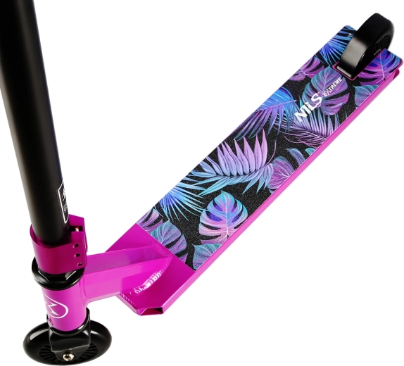 Iščete zanesljiv skiro za skatepark in ulice? Ta model znamke NILS Extreme z motivom Leaves temelji na trdni tristopenjski aluminijasti deski (decku) in širokem breznavojnem krmilu, ki je pritrjeno s trovijačno objemko za maksimalno togost. Odsotnost zložljivega mehanizma in nastavitve višine zagotavlja višjo vzdržljivost celotne konstrukcije pri izvajanju trikov.