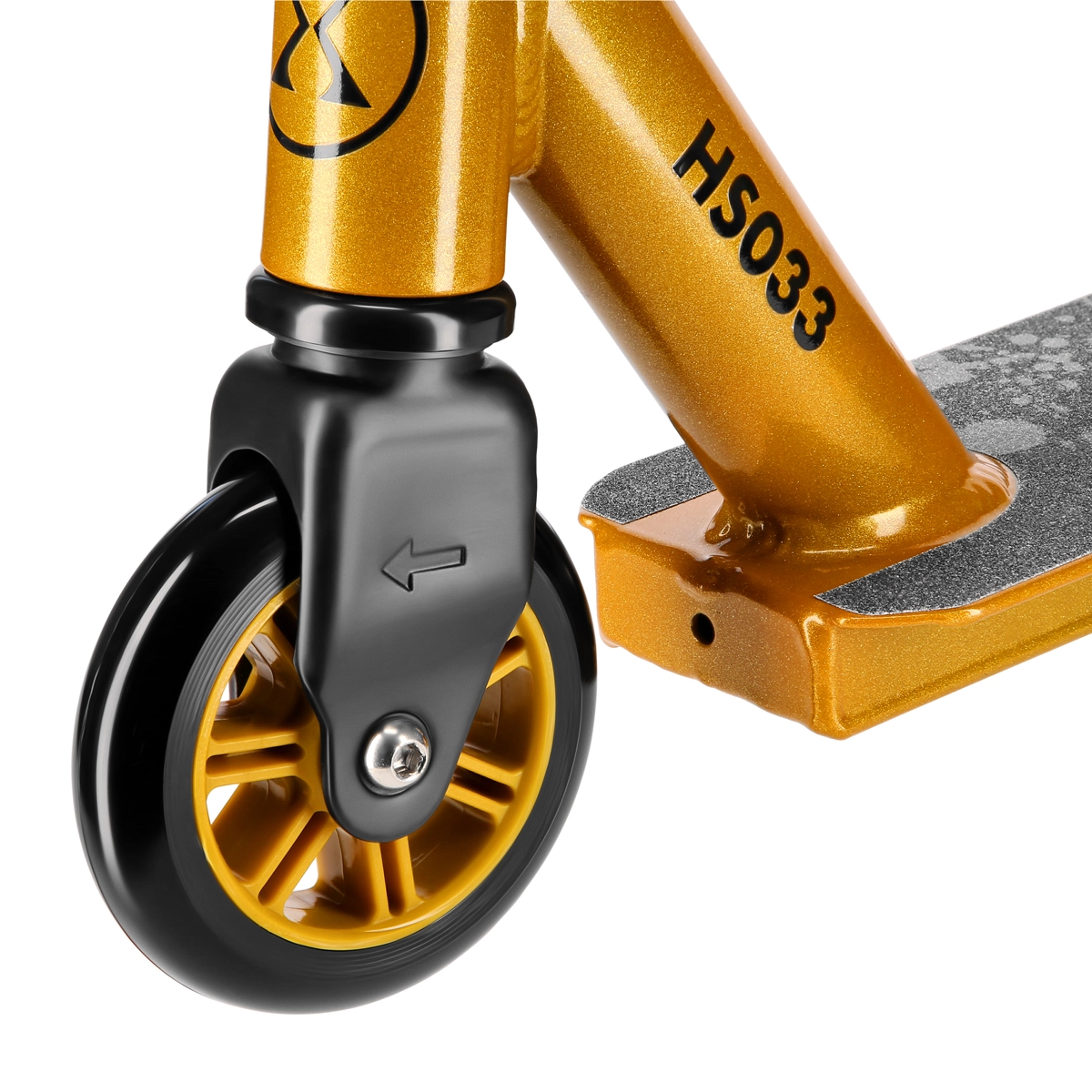 Nenavitna krmila z vrtenjem za 360° razširjajo možnosti trikov. Kolesa iz PU dimenzij 100 × 24 mm z ležaji ABEC 7 se gladko kotale in prinašajo tekočo, hitro vožnjo brez odvečnega napora. Zadnja flex fender zavora poskrbi za takojšnje in varno ustavljanje.