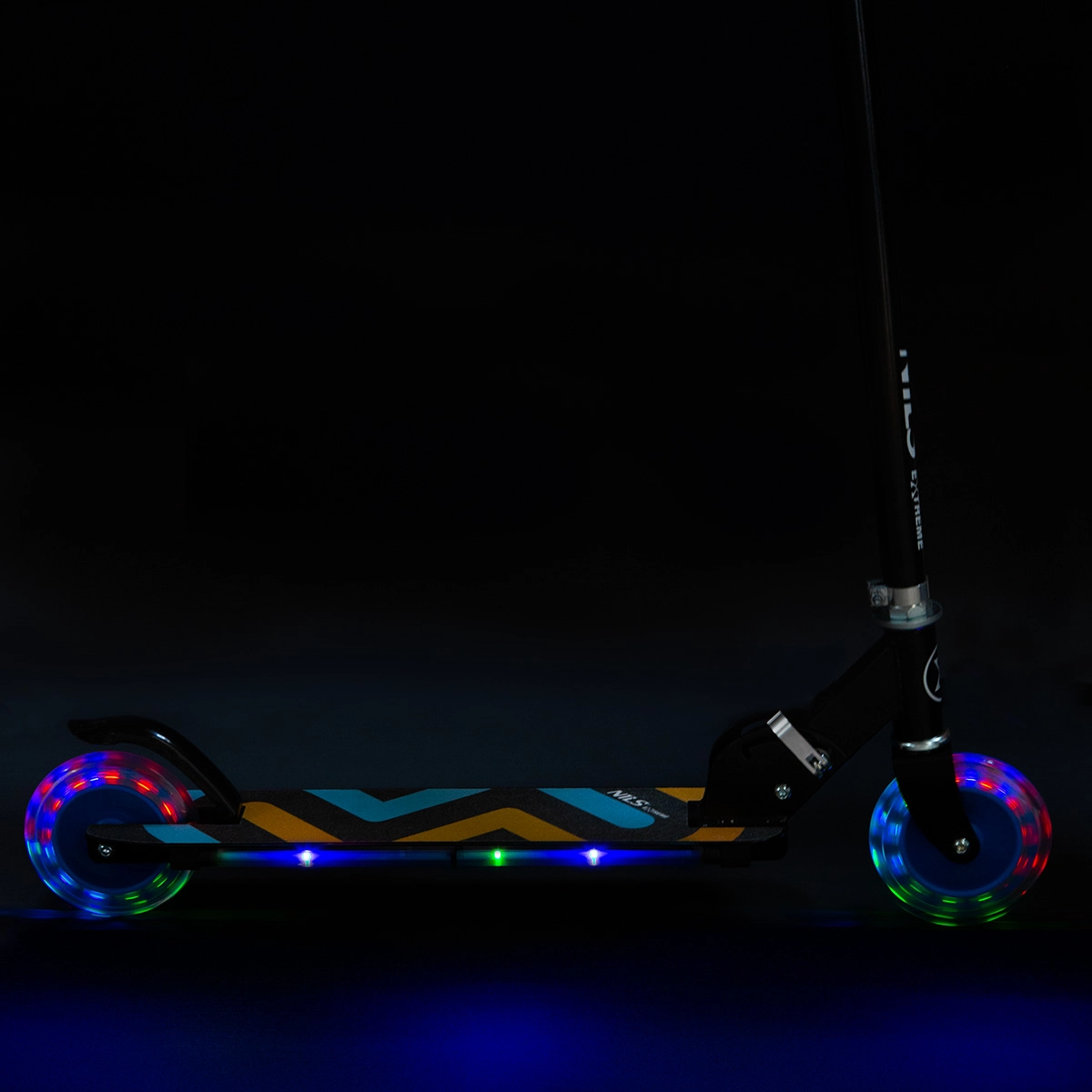 Skiro NILS Extreme HD025 združuje sodoben dizajn, nizko maso in varnost. Jekleno-aluminijasta konstrukcija je čvrsta in hkrati lahka, zato se skiro enostavno prenaša in shranjuje. LED kolesa in osvetljene bočnice stopalnega mesta povečajo vidnost v mraku ter dodajo atraktiven učinek, ki ga otroci obožujejo.