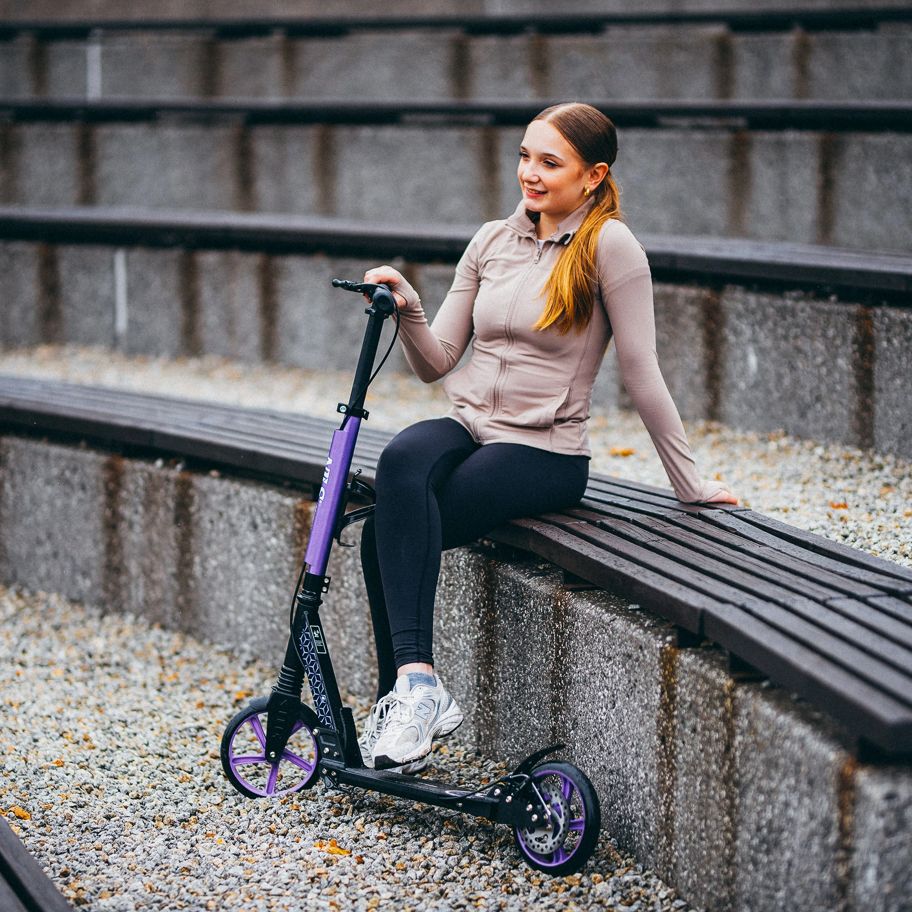 Za največjo zanesljivost je skiro opremljen z zadnjo diskasto zavoro, ki nudi močan in dobro dozirljiv zavorni učinek. Nastavljiva višina krmila 93–110 cm ustreza voznikom različnih višin, medtem ko nizek podstavek olajša odriv in ohranjanje ravnotežja. Hitro zlaganje in vgrajeno stojalo ga naredita praktičnega sopotnika na poti in v šoli.