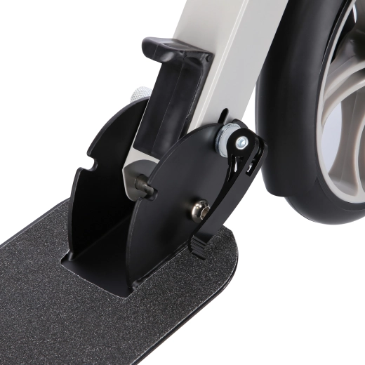Velika 200 mm PU kolesa z ležaji ABEC 7 zagotavljajo hitro, tiho in tekočo vožnjo po pločnikih in kolesarskih stezah. Nastavljivo krmilo (75–95 cm) z udobnimi gumijastimi ročaji se prilagodi višini voznika, nožna stopalna zavora na zadnjem blatniku pa nudi zanesljivo upočasnjevanje.