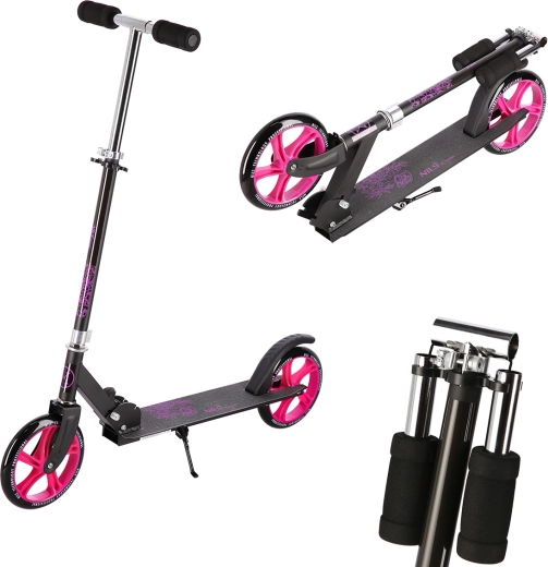 Velika 200 mm PU kolesa z ležaji ABEC 7 zagotavljajo hitro, gladko in stabilno vožnjo po asfaltu in tlakovcih. Zadnja nožna zavora omogoča takojšen nadzor hitrosti, preklopno stojalo pa omogoča, da skiro udobno odstavite brez polaganja na tla. Nosilnost do 100 kg bo razveselila tako mladostnike kot odrasle rekreativne voznike.
