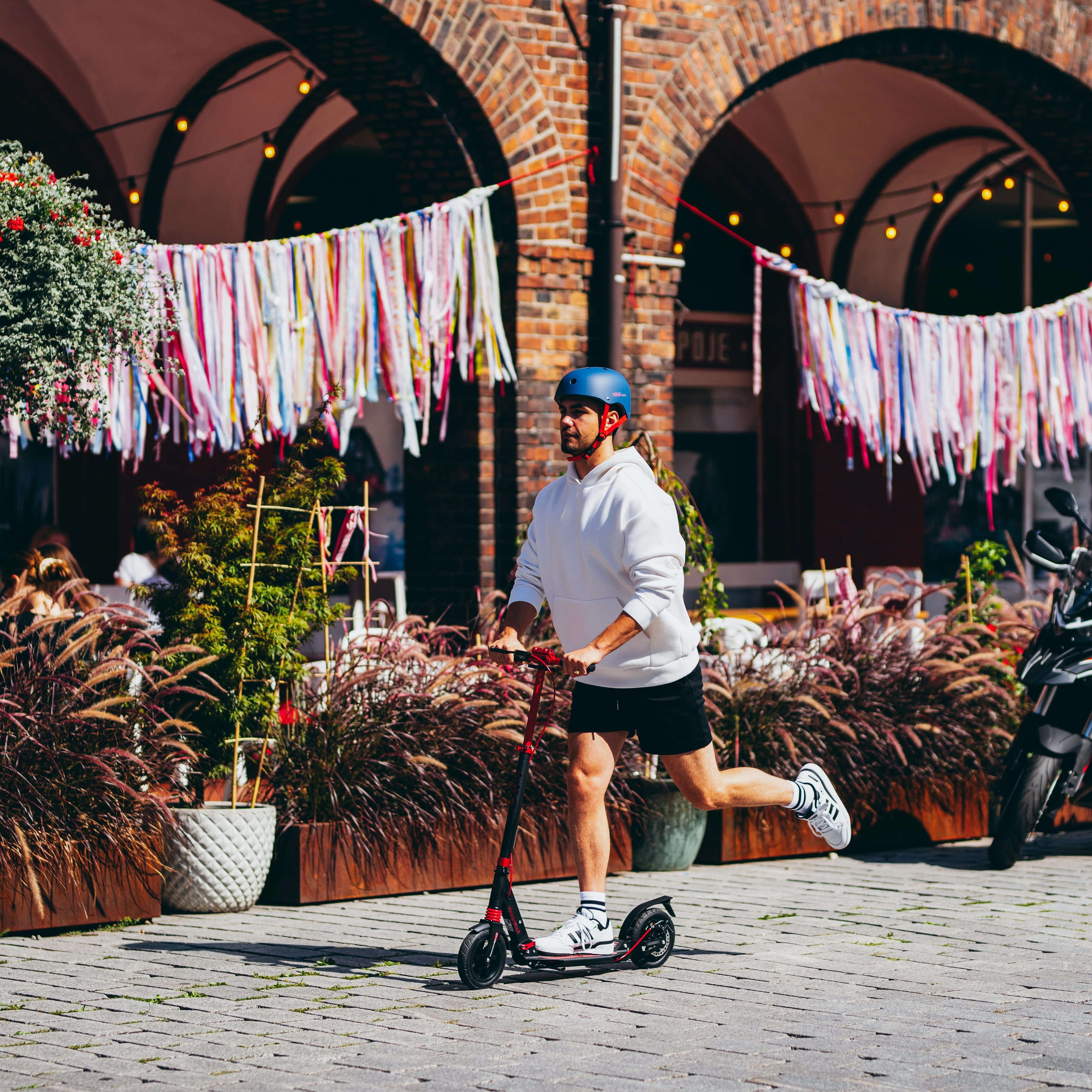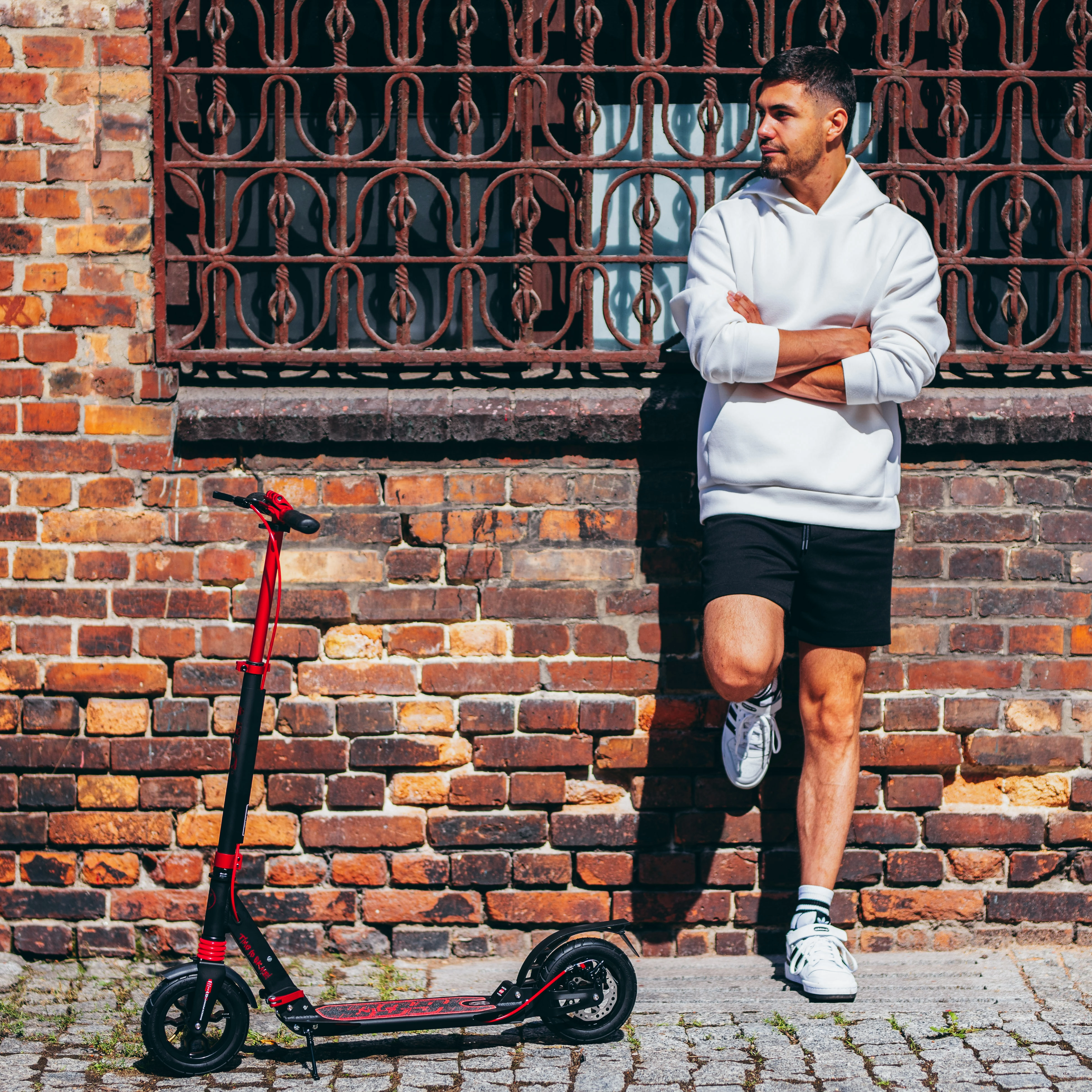 Za maksimalno varnost je zadnje kolo opremljeno s kolutno zavoro in tudi nožno zavoro z integriranim odsevnikom za boljšo vidnost v mraku. Nastavljiva višina krmila in ergonomski gumijasti ročaji zagotavljajo udoben oprijem tudi pri daljših vožnjah. Skiro zlahka zložite v kompaktne mere, s snemljivim ramenskim trakom pa ga priročno prenesete v javnem prevozu, avtomobilu ali ga shranite doma.