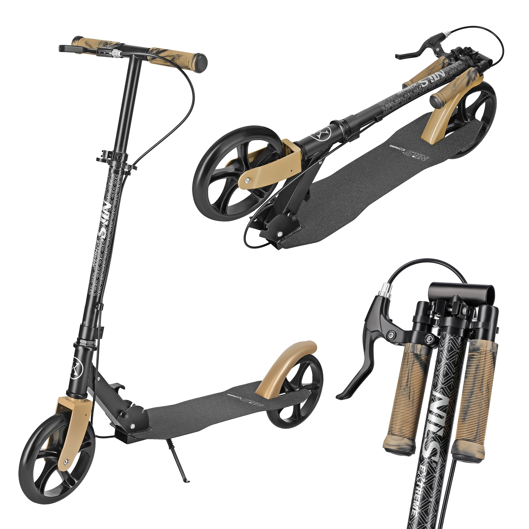 Skiro NILS Extreme HM183 v elegantni zlati kombinaciji je odlična izbira za hiter in učinkovit premik po mestu. Zaradi nizke mase 4 kg ga zlahka vzamete v javni prevoz ali pisarno, medtem ko robusten aluminijasto-jeklen okvir zagotavlja dolgo življenjsko dobo in zanesljivost pri vsakodnevni uporabi. Velika 200 mm PU kolesa z ležaji ABEC 7 zagotavljajo tiho, gladko in stabilno vožnjo po asfaltu in tlakovcih.