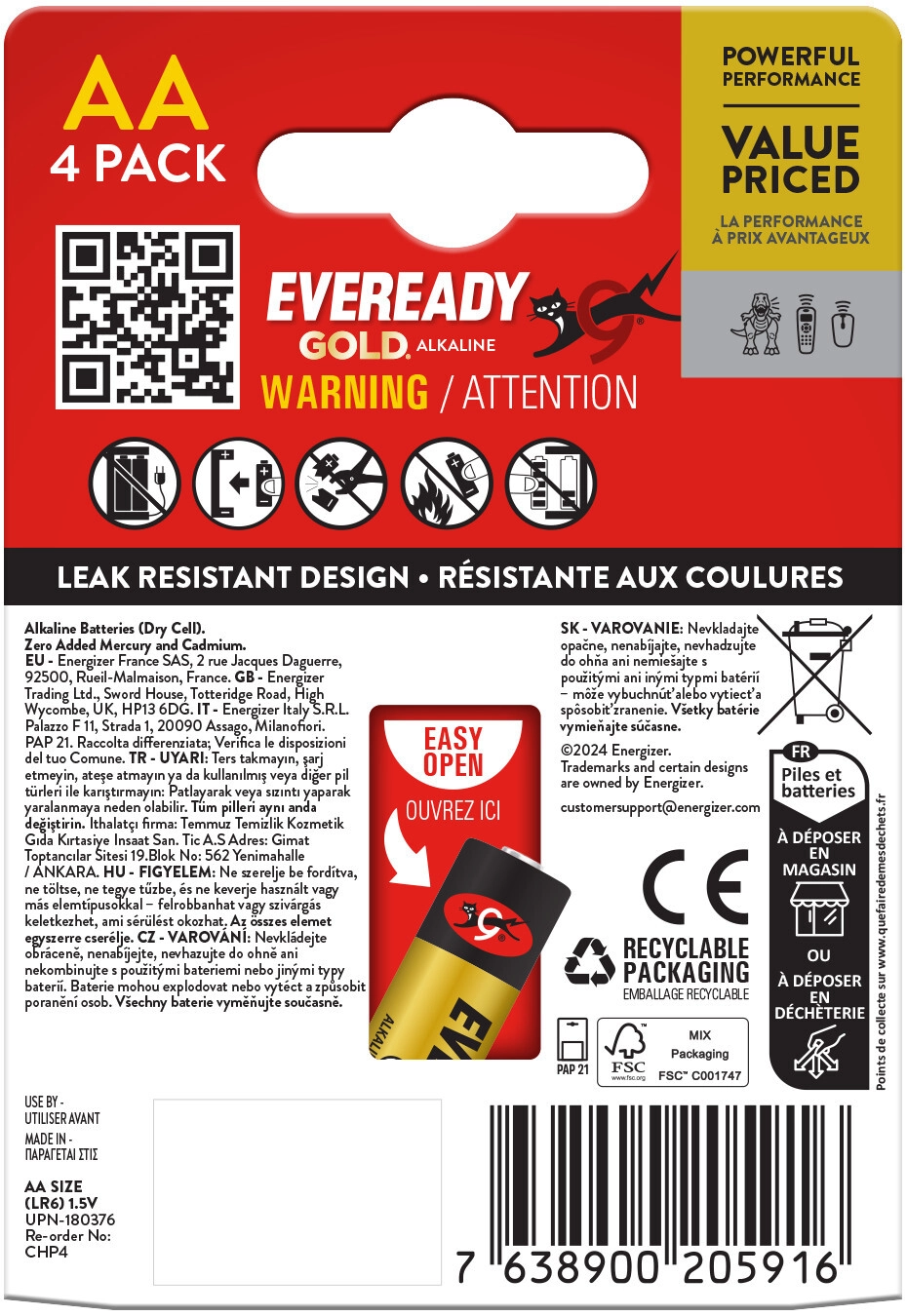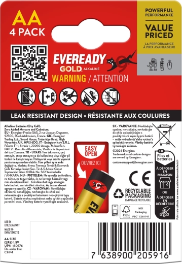 Iščete univerzalno napajanje za domačo elektroniko? ENERGIZER Eveready Gold velikosti AA so alkalne baterije, zasnovane za zanesljivo delovanje naprav z nizko do srednjo porabo. Ponuja jo dolgotrajno energijo in nižjo samopraznitev v primerjavi s cink-ogljikovimi alternativami.