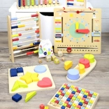 Učenje poteka na igriv način – otroci vzamejo posamezne delčke z nalogami, poiščejo pravilne rešitve in jih vrnejo v mrežo. Zahvaljujoč preglednemu barvnemu kodiranju in praktičnemu lesenemu okvirju je vse lepo urejeno.