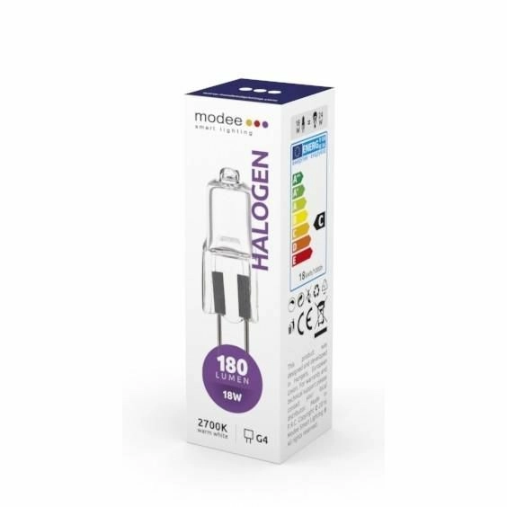 Halogenska žarnica MODEE G4 18 W je idealna zamenjava za dekorativno in funkcionalno osvetlitev v lestencih, svetilkah in vgradnih svetilih. Ponuja prijetno toplo belo svetlobo (2700 K), je zatemnljiva in sveti takoj po vklopu brez zamika.