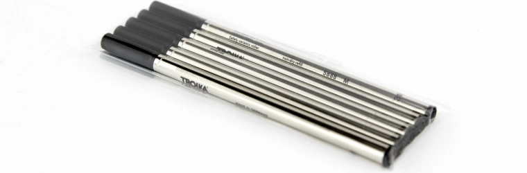 Praktičen komplet nadomestnih vložkov za pisala TROIKA s keramično konico za gladko in natančno pisanje. Vsebuje 5 hitro sušečih se črnih vložkov s širino poteze M, idealnih za vsakodnevno uporabo brez packanja. Združljivo z izbranimi modeli TROIKA (PEN65/BK, PEN10/.., PEN84/..).