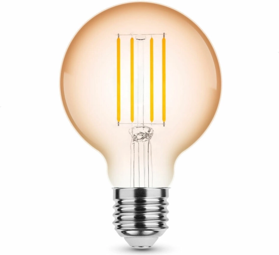 Stilna LED žarnica okrogle oblike G80 s tehnologijo filament in jantarno obarvanim steklom ustvarja prijetno toplo belo (1800 K). Ponuja 360 lm, kot sevanja 320°, navoj E27 in varčno moč 4 W. Idealna za dekorativno osvetlitev in svetila, usmerjena navzdol, z življenjsko dobo do 15.000 ur.