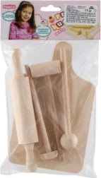 Set je izdelan iz kakovostnega lesa z gladko površino za udobno in varno uporabo. Z univerzalnimi kosi – rezalno desko, valjarjem in tolkačem – bodo otroci zlahka posnemali pripravo hrane in se učili osnovnih kuhinjskih opravil.