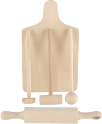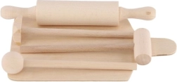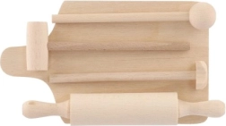 Realistična izvedba rezalne deske, valjarja in tolkača spodbuja otroke k posnemovalni igri in krepi zdravo domišljijo.