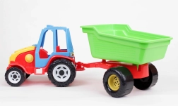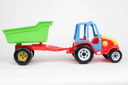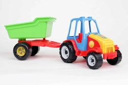 Odkrijte zabavo s stabilnim plastičnim traktorjem z enoosnim priklopnikom, ki ga je mogoče preprosto odklopiti in nagniti nazaj. Velika črna kolesa zagotavljajo gladko vožnjo po tleh in v pesku, barvita izvedba pa vabi k vsakodnevni igri. Igrača je izdelana iz kakovostnih in varnih materialov, ki ne vsebujejo spojin težkih kovin.