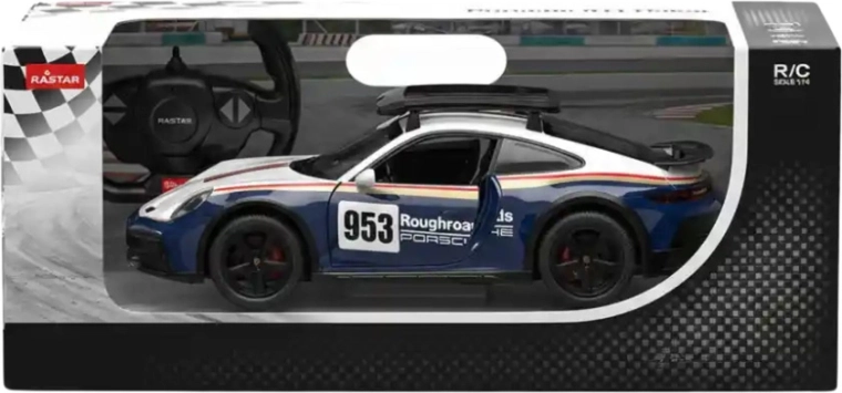 Licencirano R/C avto PORSCHE 911 Dakar znamke RASTAR v merilu 1:14 ponuja realistično izdelavo, gladko upravljanje 2,4 GHz in odlične vozne lastnosti. Odpiralna vrata, LED luči, štirikolesna amortizacija, gumene pnevmatike z visokim oprijemom in diferencial zagotavljajo zabavo tudi na neravnih podlagah. Odstranljiv strešni nosilec in podroben lak v poklon legendarnemu Porscheju 953 bosta razveselila tako zbiratelje kot otroke.