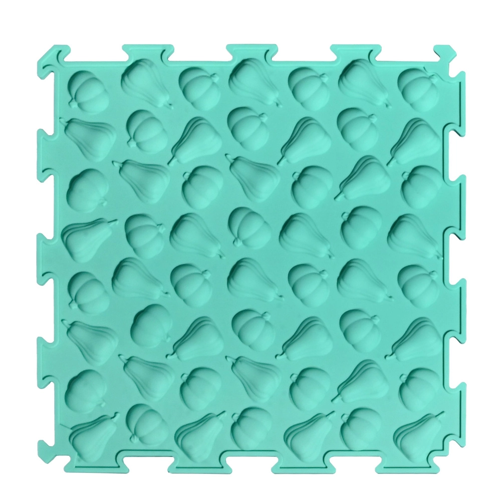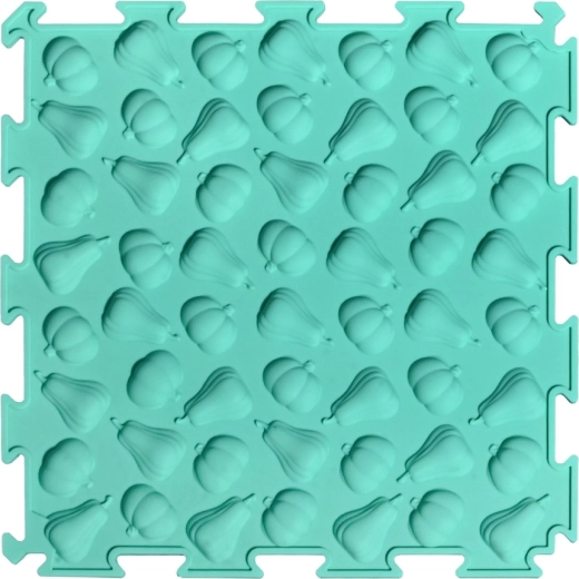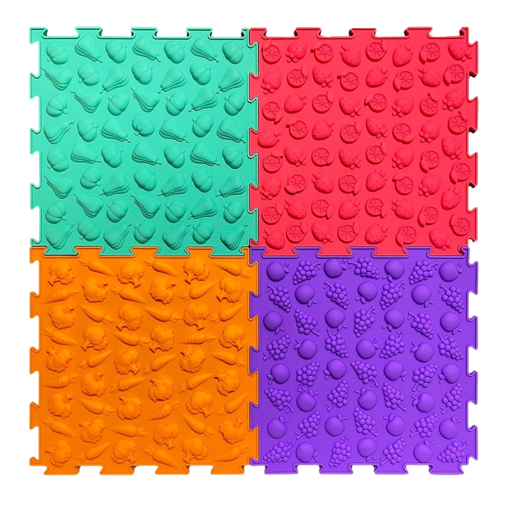 Vsaka ploščica ima svojo strukturo in relief (sadje, zelenjava ter igrivi vzorci), ki nežno masirajo stopala, spodbujajo krvni obtok in razvijajo tip.