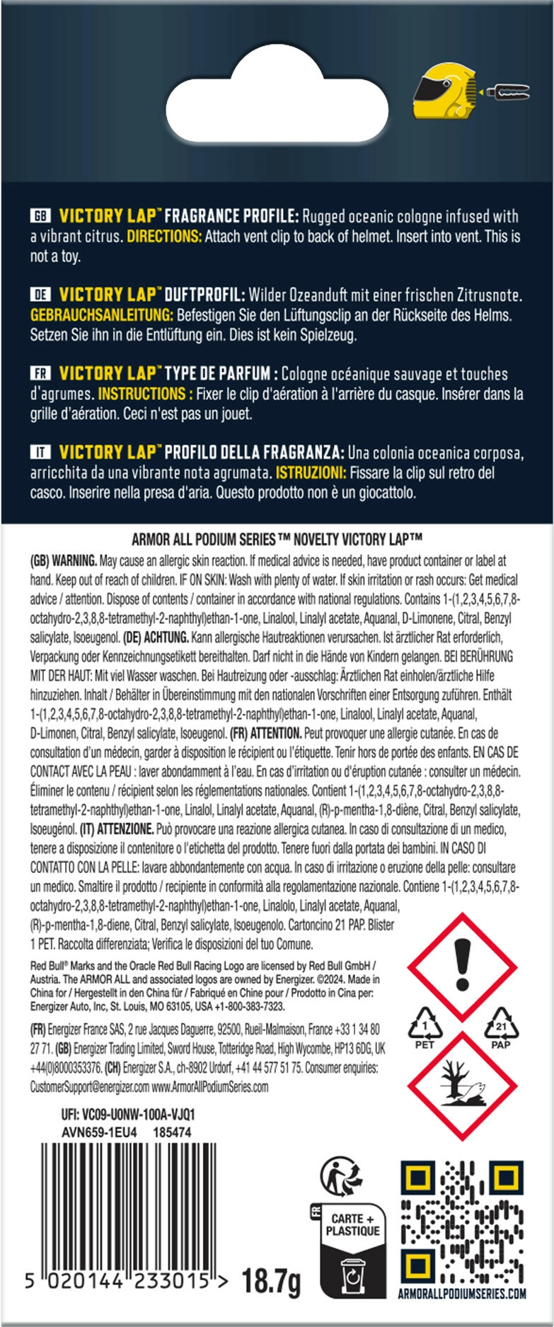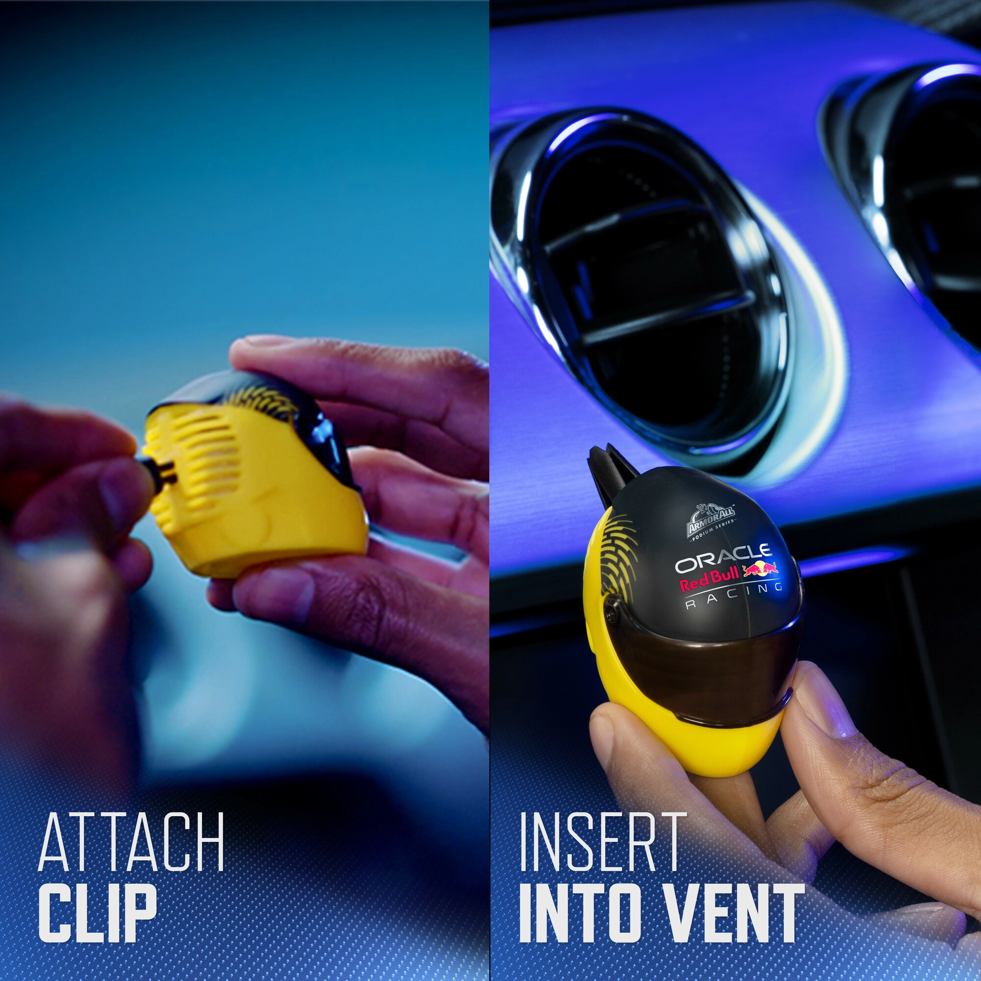 Stilska 3D avtomobilska dišava Armor All Oracle Red Bull Victory Lap – Helmet Vent spremeni vsak kilometer v prijetno izkušnjo. Zahvaljujoč edinstvenemu dizajnu, navdihnjenemu s sodelovanjem z ORACLE RED BULL RACING, odlično izgleda in hkrati prijetno diši. Preprosto se pritrdi na večino zračnikov, ima nastavljivo okence za uravnavanje intenzivnosti dišave in prinaša osvežujočo mešanico oceanské vode in citrusov.