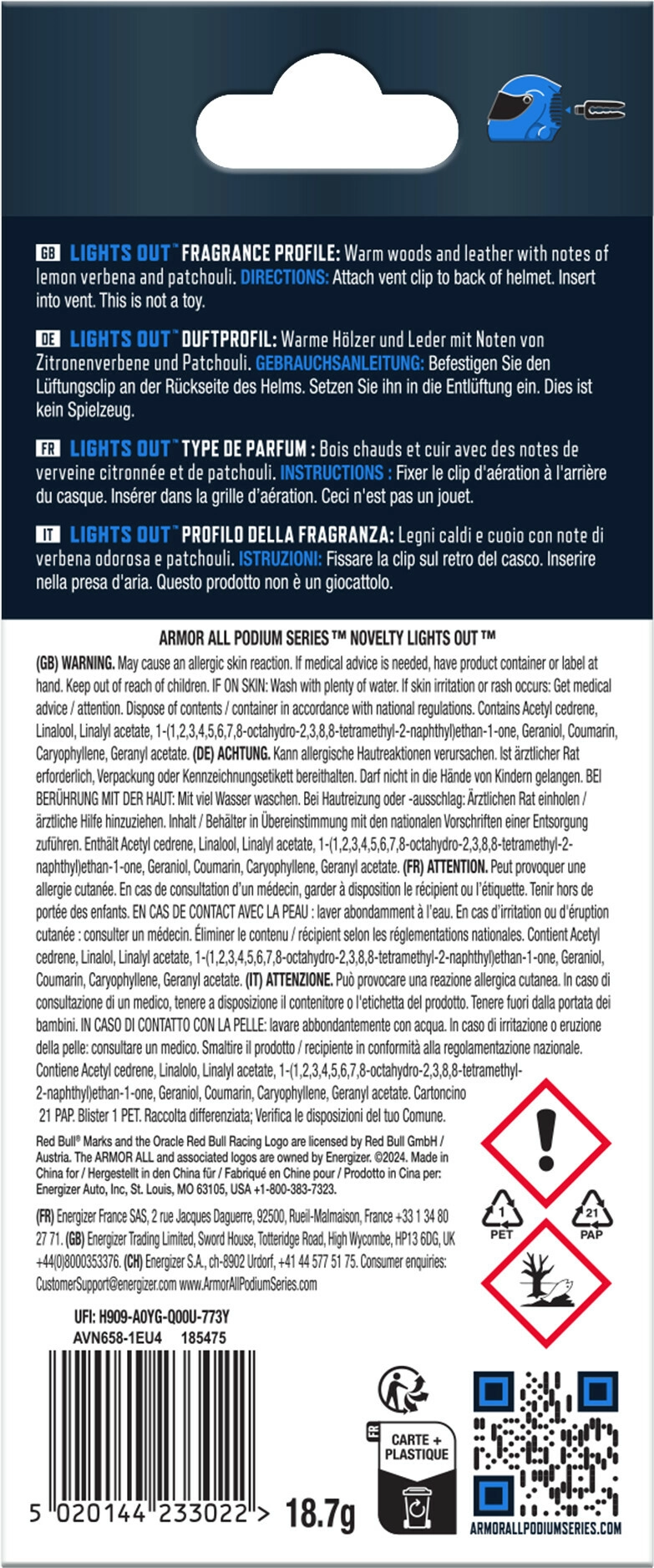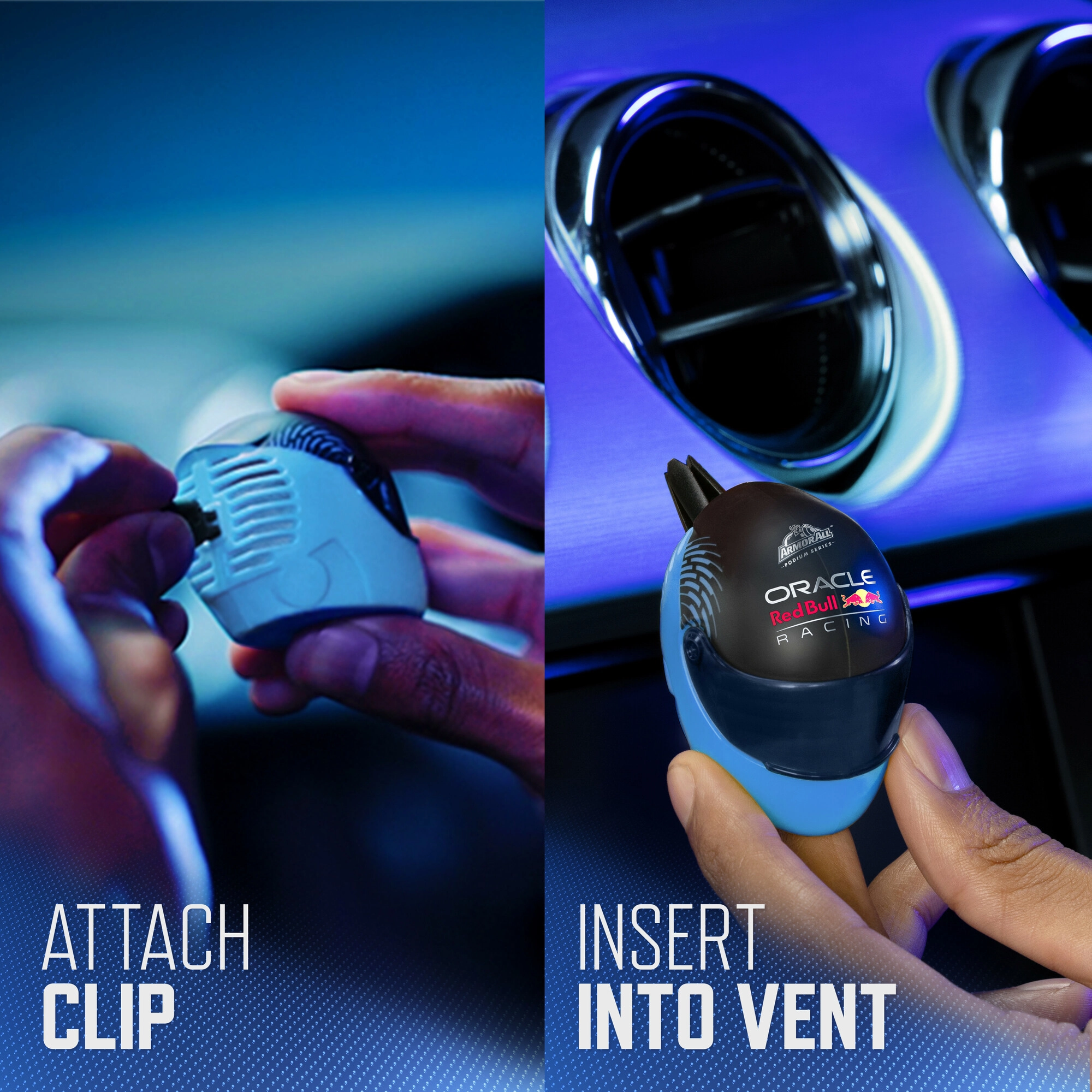 Stilska 3D dišava za avto Armor All Oracle Red Bull Lights Out Helmet Vent prinaša izraženo in dolgotrajno dišavo v ikonični zasnovi, navdihnjeni z ORACLE RED BULL RACING. Preprosto se pritrdi na večino zračnikov, ponuja nastavljivo intenzivnost in takoj osveži notranjost s kombinacijo toplega lesa, usnja, citronove verbene in pačulija.