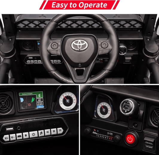 Stilski otroški električni avto, navdihnjen po modelu TOYOTA, ponuja realističen vozniški občutek, upravljanje z otrokom ali staršem prek 2,4 GHz daljinskega upravljalnika, multimedijsko ploščo z USB/AUX/MP3/SD/Bluetooth in varno, tiho vožnjo zahvaljujoč EVA kolesom, varnostnim pasom in sedežu iz eko usnja.