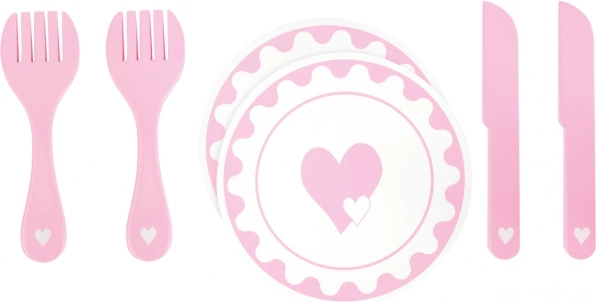 Majhen leseni komplet je okrašen s srčki in je izdelan iz 100% certificiranega FSC® lesa. Otroci ne bodo le navdušeni nad lepim dizajnom, ampak se bodo tudi naučili nekaj o ekologiji in trajnostni rabi virov.