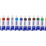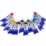 Set vsebuje izbor 12 priljubljenih odtenkov v 12-ml tubah: svetlo in temno modra, svetlo in temno zelena, svetlo in temno rumena, svetlo in temno rdeča, svetlo in temno rjava, bela in črna. Aluminijaste tube z navojnim zapiralom omogočajo natančno doziranje in ščitijo barvo pred izsuševanjem.