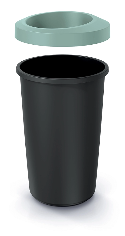 Ohišje iz reciklirane črne plastike je odporno in lahko, kar olajša rokovanje in prenašanje. Svetlo zelen pokrov pomaga pri preglednem ločevanju odpadkov in prostoru doda svež poudarek.