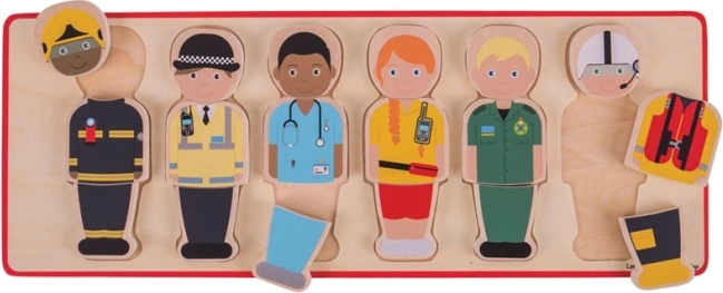 Naredite učenje zabavno z leseno sestavljanko Reševalna ekipa. Ta pisana sestavljanka ponuja šest likov reševalcev — gasilca, policista, zdravnika in druge, ki se prilegajo izrezanim mestom na plošči.