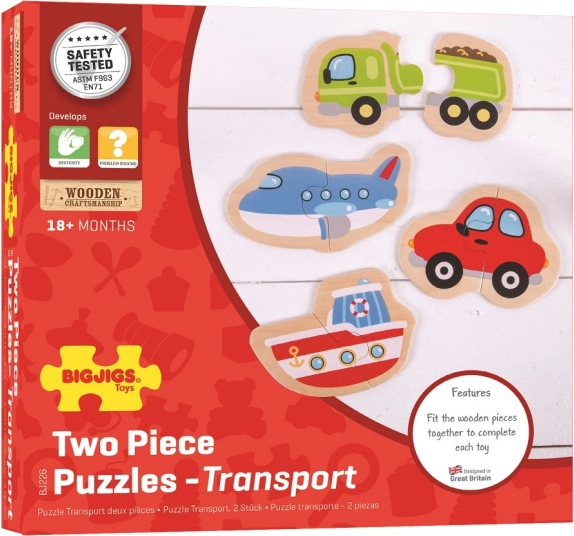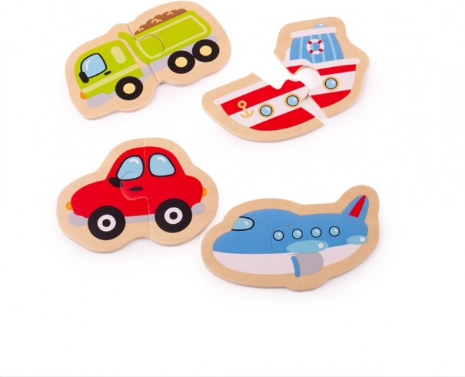 Ta komplet lesenih puzzlov prinaša štiri priljubljena prevozna sredstva, ki jih otroci zlahka sestavijo iz dveh trdnih delov. Preproste oblike, izrazite barve in prijetna lesena izvedba vabijo k ponavljajoči se igri ter naravno podpirajo razvoj govora, prepoznavanje oblik in barv ter osredotočenost.