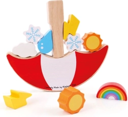 Zabavna lesena balansirna igra v obliki dežnika, ki uri koordinacijo oko–roka, fino motoriko in potrpežljivost. Otroci in odrasli nalagajo na zibajoči se dežnik barvne vremenske koščke – sonce, oblak, mavrico, snežinko, kapljo dežja in strelo – ter jih skušajo uravnotežiti brez prevrnitve. Kakovostna lesena izvedba, varna in trpežna, idealna za skupno družinsko zabavo.