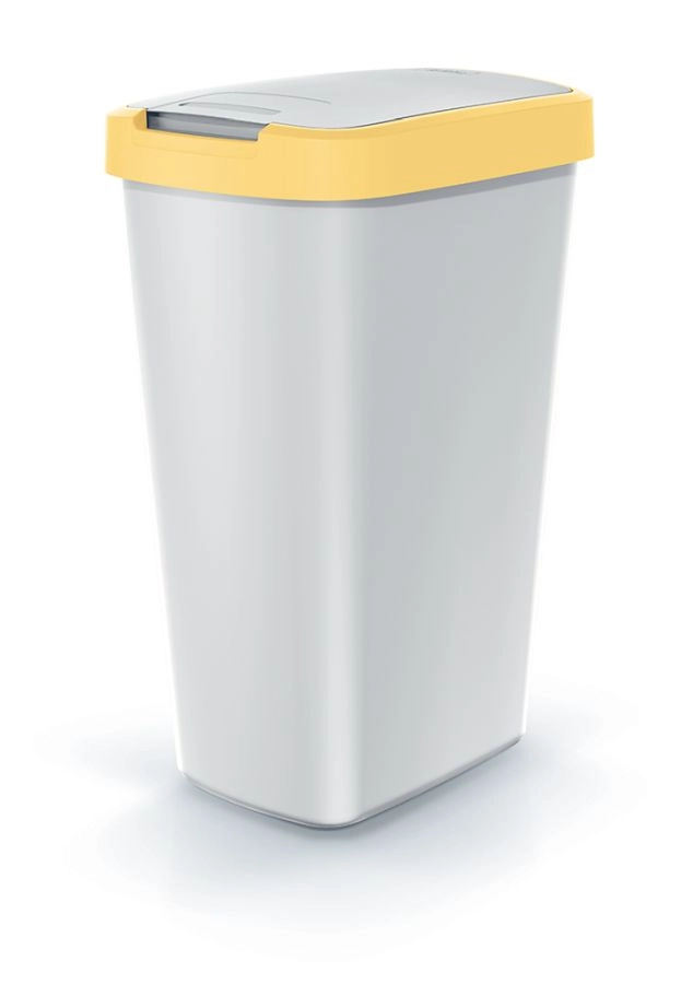 Praktičen koš za odpadke s prostornino 45 l v moderni pepelnato sivi barvi s svetlo rumenim pokrovom je idealen za gospodinjstva in pisarne. Zahvaljujoč ozki obliki se zlahka prilega manjšim prostorom, pokrov na loputo z dvema načinoma odpiranja zagotavlja udobno in higiensko uporabo, estetski okvir pa drži vrečko trdno na mestu. Trpežna plastika omogoča preprosto vzdrževanje in dolgo življenjsko dobo.