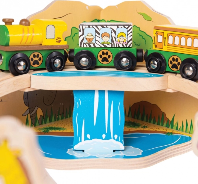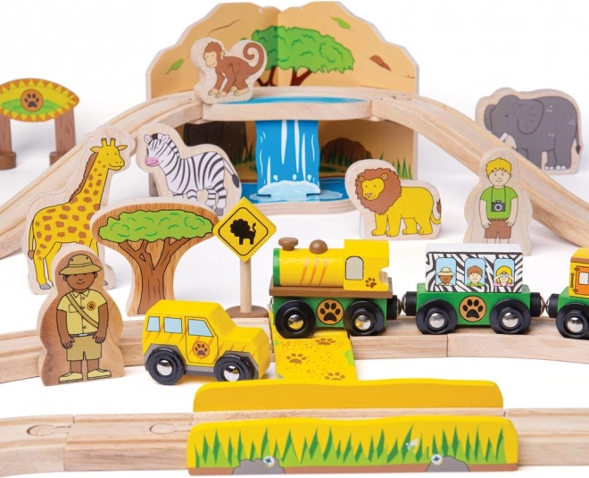 Odkrijte svet safarija z barvito in trpežno leseno železnico, ki razveseli otroke od 3. leta dalje. Set vključuje živali, kot so slon, zebra in opica, drevesa, znake in most, po katerem vozi rumena lokomotiva z dvema vagončkoma. Zahvaljujoč magnetnim spojkam je igra intuitivna in razširljiva.