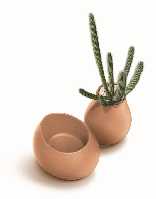 Zaobljena silhueta, ki spominja na vazo, in mat tekstura prostoru dodata čist, eleganten videz ter poudarita zelenje in dekorativne aranžmaje.
