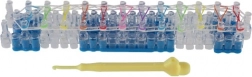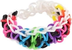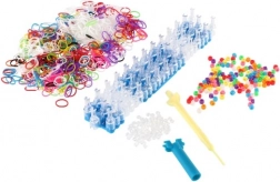 pribl. 700 silikonskih elastik različnih barv, trivrsti pletilni statv, kvačka, pripomoček za vdevanje, 20 zapiral, barvite perlice, ilustrirana navodila
