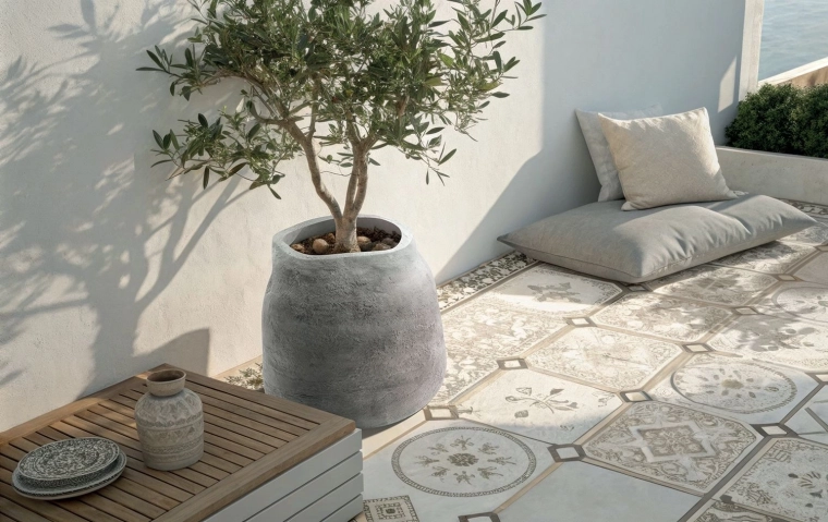 - Naravni videz, navdihnjen s keramiko in kamnom, z mat, rahlo grobo površino.