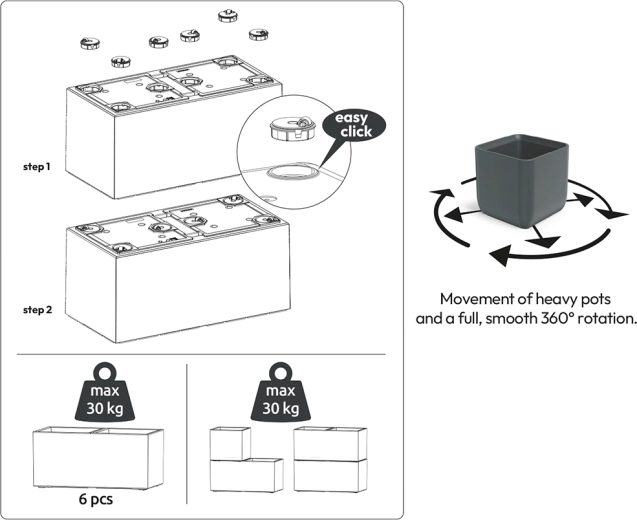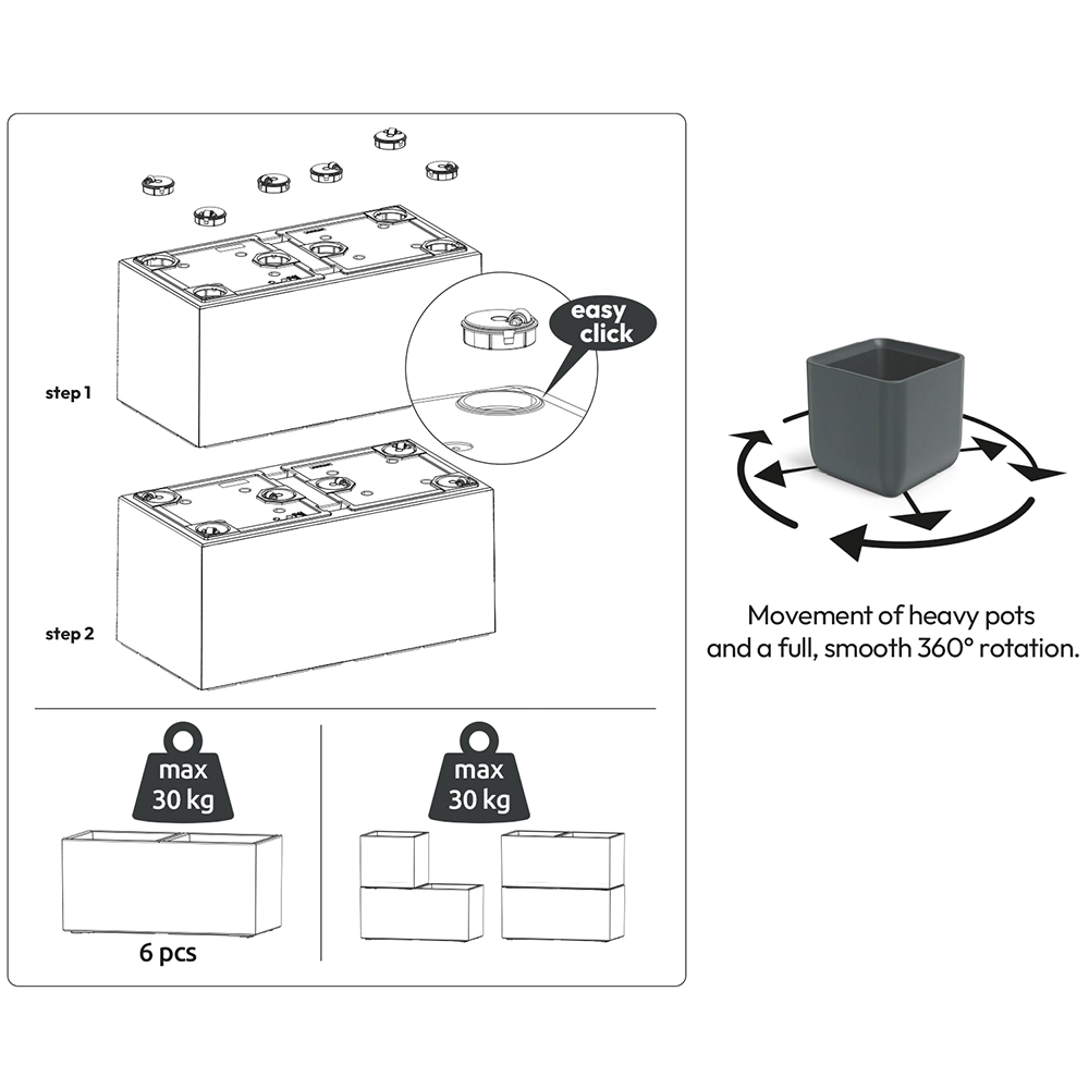 Vgrajeni samozalivalni sistem ohranja idealno vlažnost substrata, zato rastline uspevajo tudi ob redkejšem zalivanju. Nogice z imitacijo lesa zagotavljajo stabilnost, boljše prezračevanje dna ter eleganten videz tako na terasi kot v dnevnem prostoru.