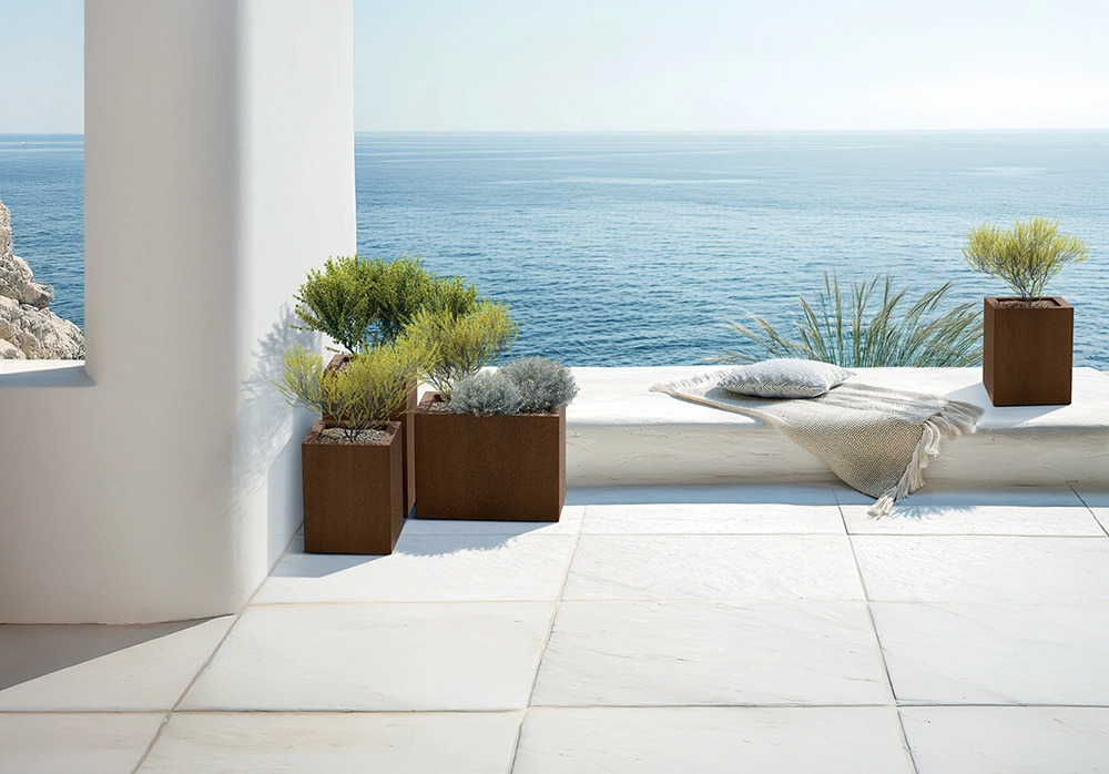 Minimalistična oglata oblika v rjasto rjavem tonu se lepo ujema z naravnimi materiali in poudari zelenje na balkonu, terasi ali v dnevni sobi.