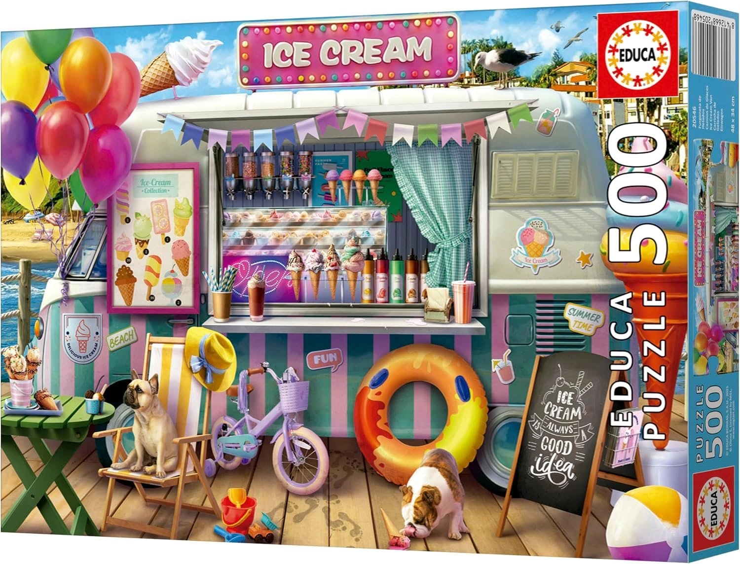 Uživajte v trenutkih sprostitve s kakovostnimi sestavljankami EDUCA. Z motivom sladolednega vozila in 500 kosi ponuja idealen izziv za otroke in odrasle. Del pakiranja je LEPILO BREZPLAČNO za enostavno fiksiranje končne slike v velikosti 48 × 34 cm.