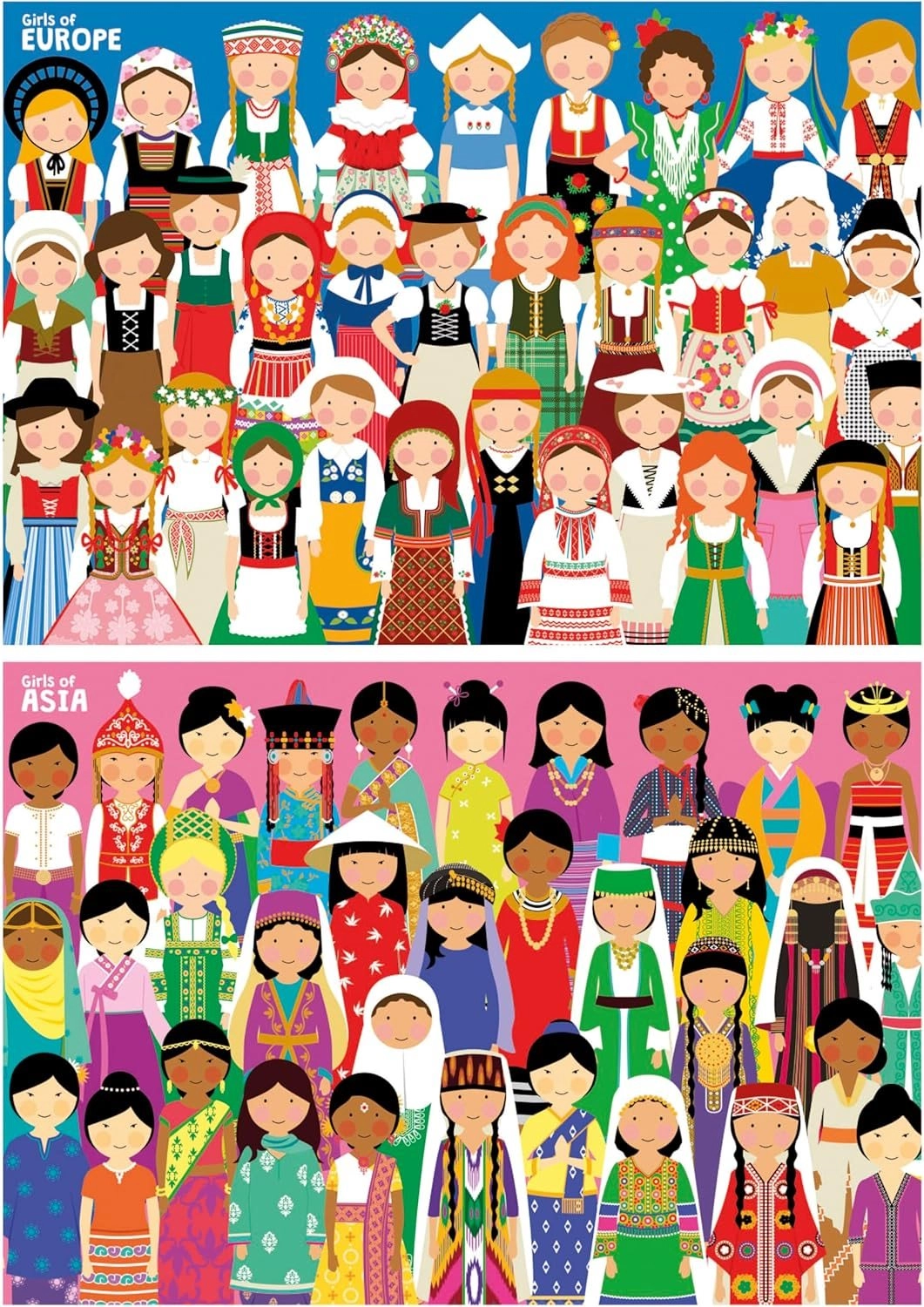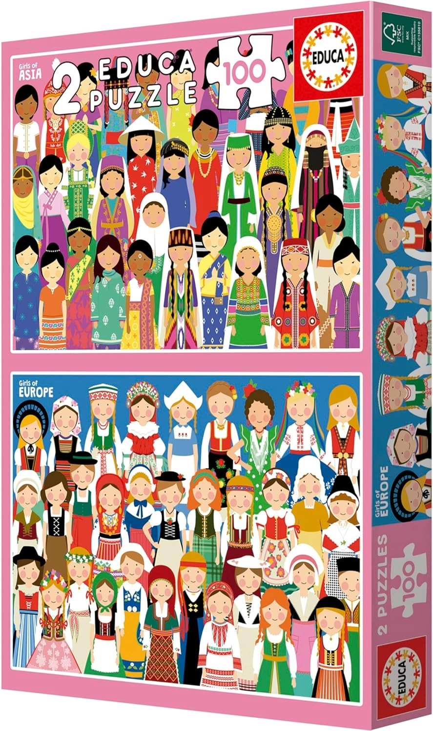 Odkrijte čar sveta z dvojico kakovostnih sestavljank znamke EDUCA. Paket prinaša dve različni sestavljanki po 100 kosov, idealni za otroke in začetnike. Vsaka sestavljanka ima po sestavitvi dimenzije pribl. 40 × 28 cm in navduši z nežnimi ilustracijami deklet iz Evrope in Azije.