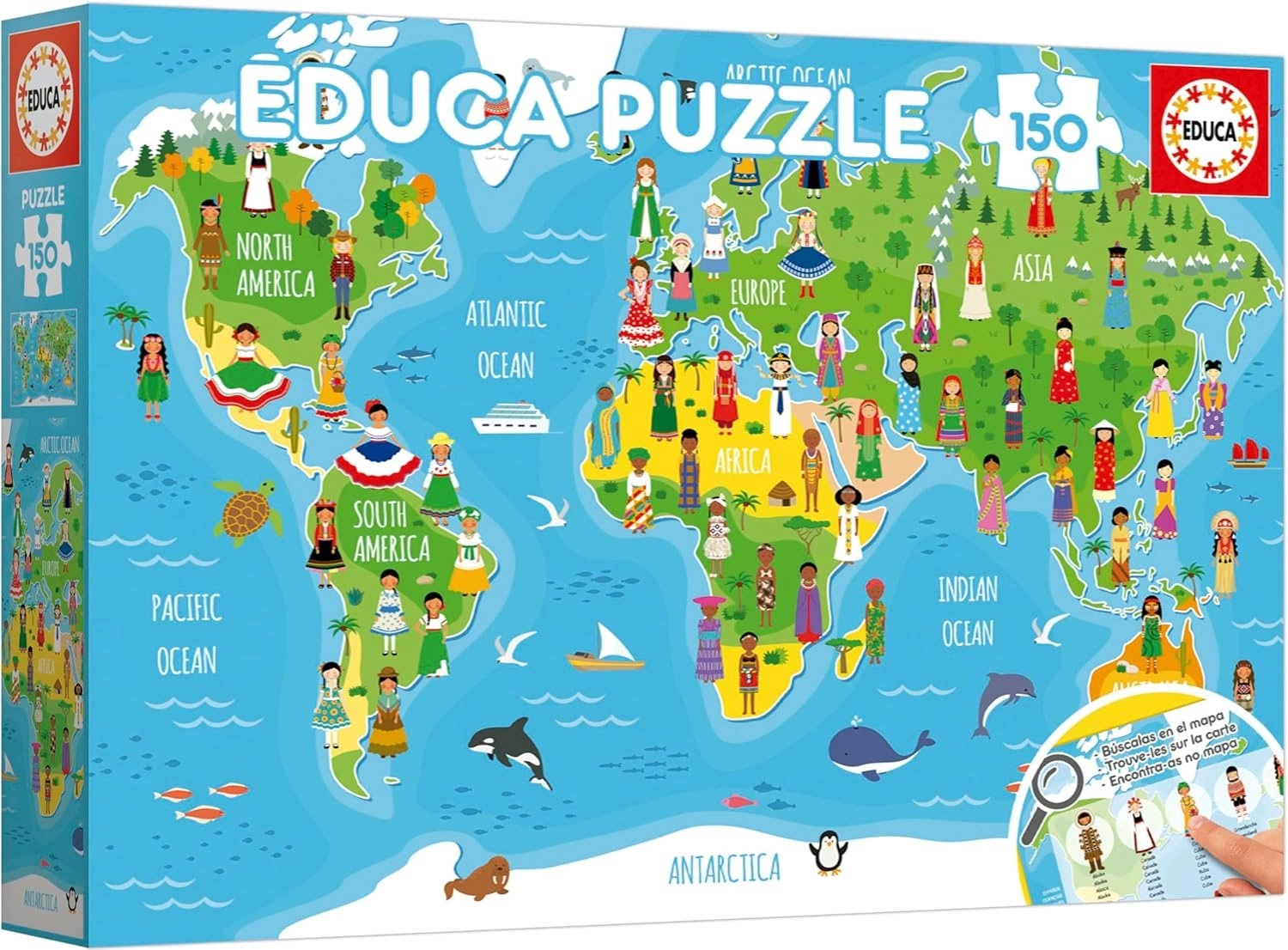 Izobraževalna sestavljanka otrokom ponuja zabaven način spoznavanja kontinentov, držav in kultur. Po sestavitvi nastane pregleden zemljevid velikosti približno 48 × 34 cm, na katerem lahko mali raziskovalci poiščejo like deklic in jih povežejo s posameznimi državami.