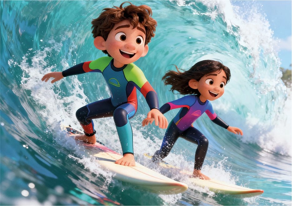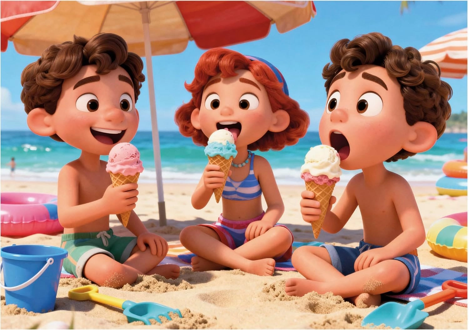 Barvite prizore s plaže z otroki in poletnim vzdušjem spodbujajo domišljijo in učenje spreminjajo v zabavo.