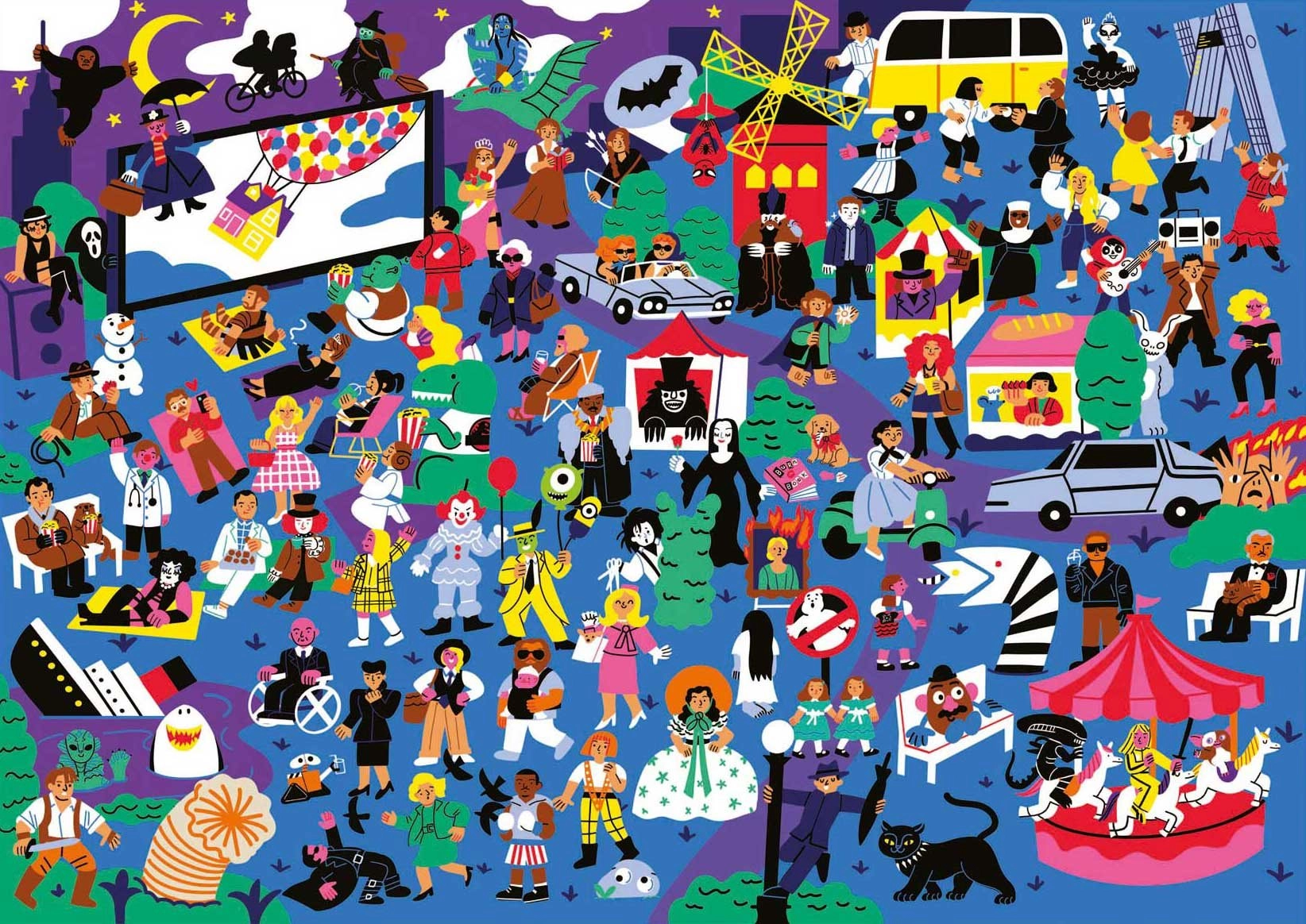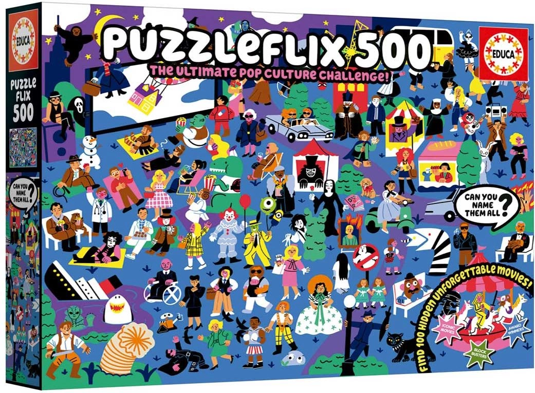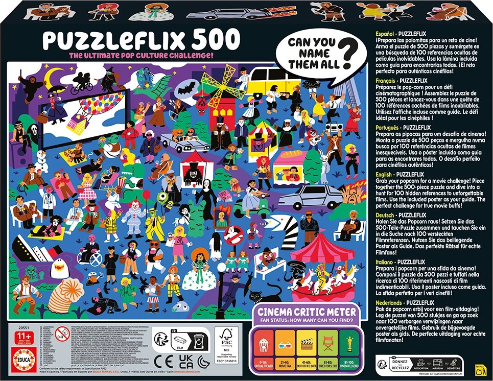 Odkrijte svet kinematografije ob sestavljanju izvirne sestavljanke EDUCA Puzzleflix. Na sliki je skritih 100 namigov na nepozabne filme, ki bodo razveselili tako izkušene filmske oboževalce kot ljubitelje ugank. Priloženi plakat vam služi kot namig in vodnik, da ne spregledate nobene podrobnosti.