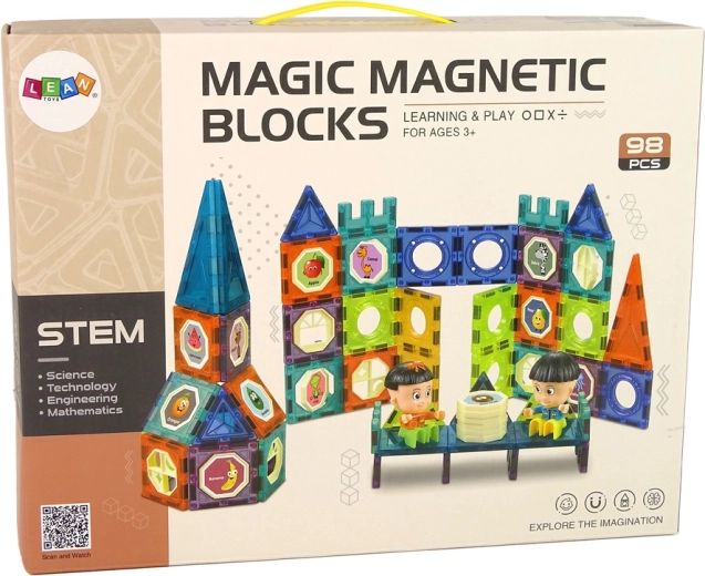 Odkrijte ustvarjalni svet z magnetno konstrukcijsko setom s 98 kosi, ki omogoča gradnjo 3D konstrukcij, kot sta grad ali vrtiljak. Spodbuja fino motoriko, logično razmišljanje in kreativnost. Deli z magneti in zaskočnimi elementi se enostavno povezujejo in razstavljajo. Priložene so nalepke z živalmi, sadjem in zelenjavo, 2 figurici ter navodila. Varni, trpežni materiali, certifikat CE, primerno od 3 let.