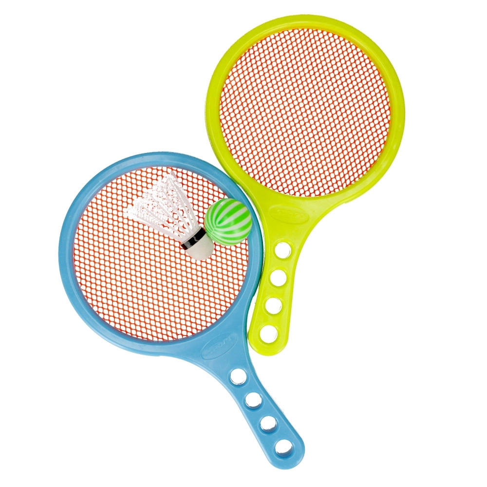 Zabaven otroški komplet loparjev s košarico in žogico prinaša lahko in varno igro na vrtu, plaži ali igrišču. V kompletu sta 2 loparja, badmintonova košarica in mehka žogica za vsestransko igranje. Lahka plastična zasnova in enostaven oprijem sta idealna za otroke od 3 let dalje.