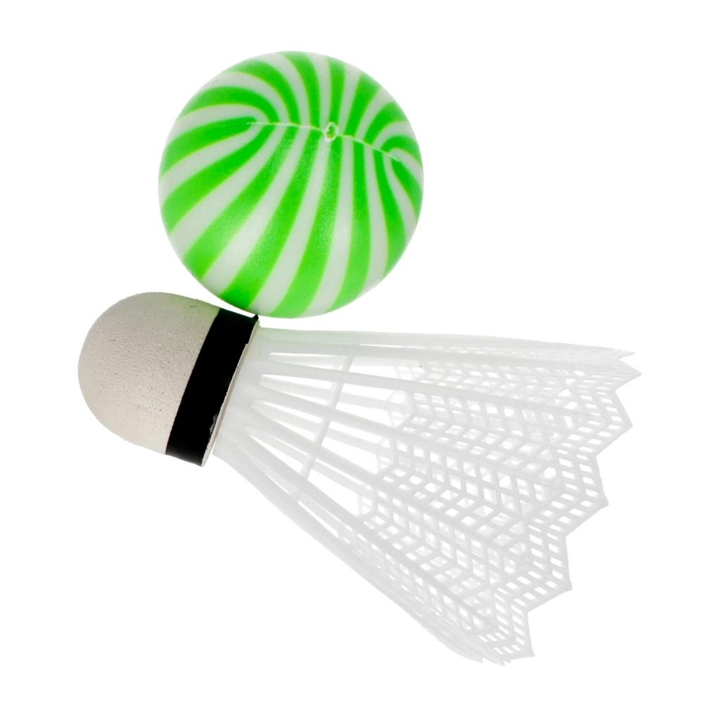 Vključeni sta badmintonova košarica in mehka žogica. Otroci lahko izberejo, ali želijo igrati lahek »badminton« ali preprosto odbijanje z žogico.