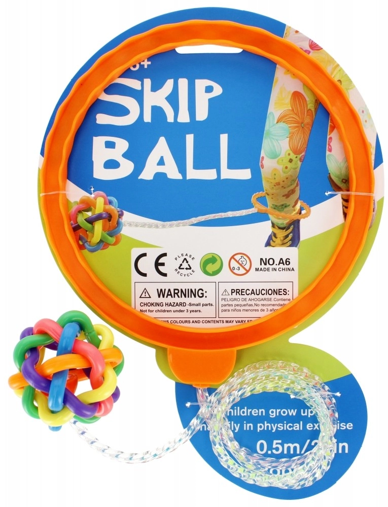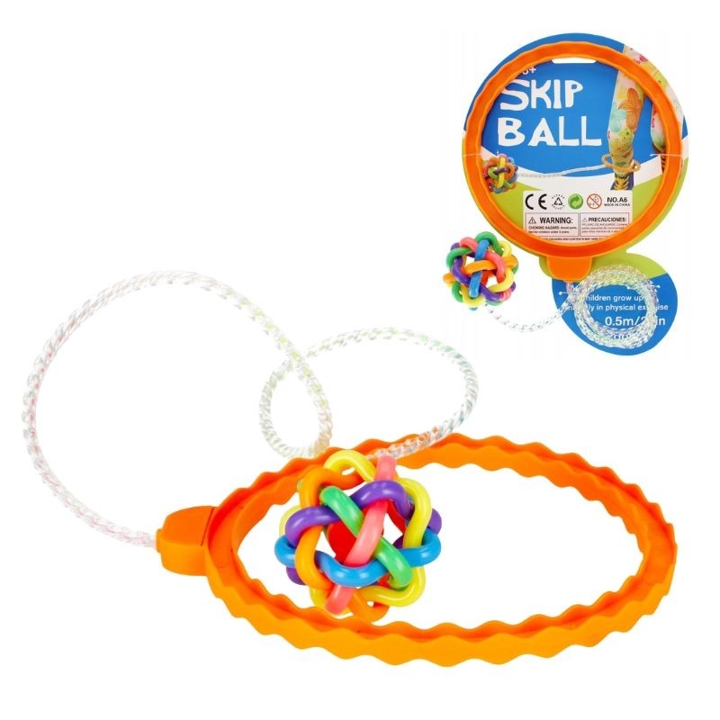Skakajoča žogica za na nogo z obročem je lahka in barvita igrača, ki otroke spodbuja k aktivnemu gibanju. Obroč se preprosto namesti na gleženj, žogica na vrvici se zavrti, otrok pa jo z drugo nogo preskakuje. Med igro se razvijajo ravnotežje, spretnost in koordinacija oko–noga.