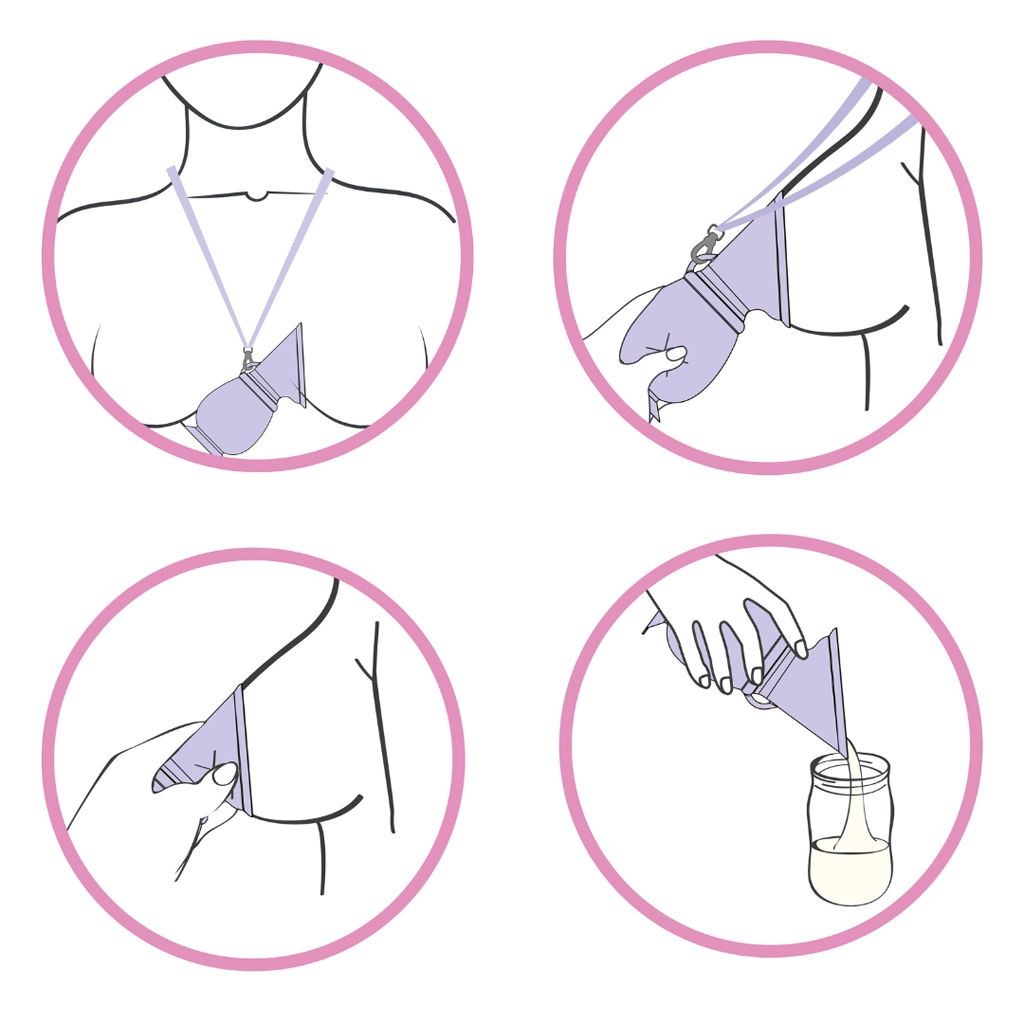 Zbiralnik se po nežnem stisku sam prisesa na dojko in med dojenjem ali sočasnim črpanjem z druge strani udobno zbira mleko – brez uporabe rok.
