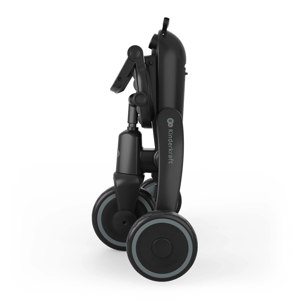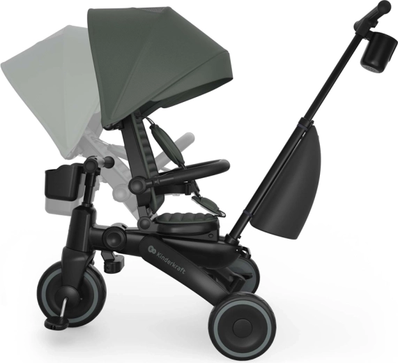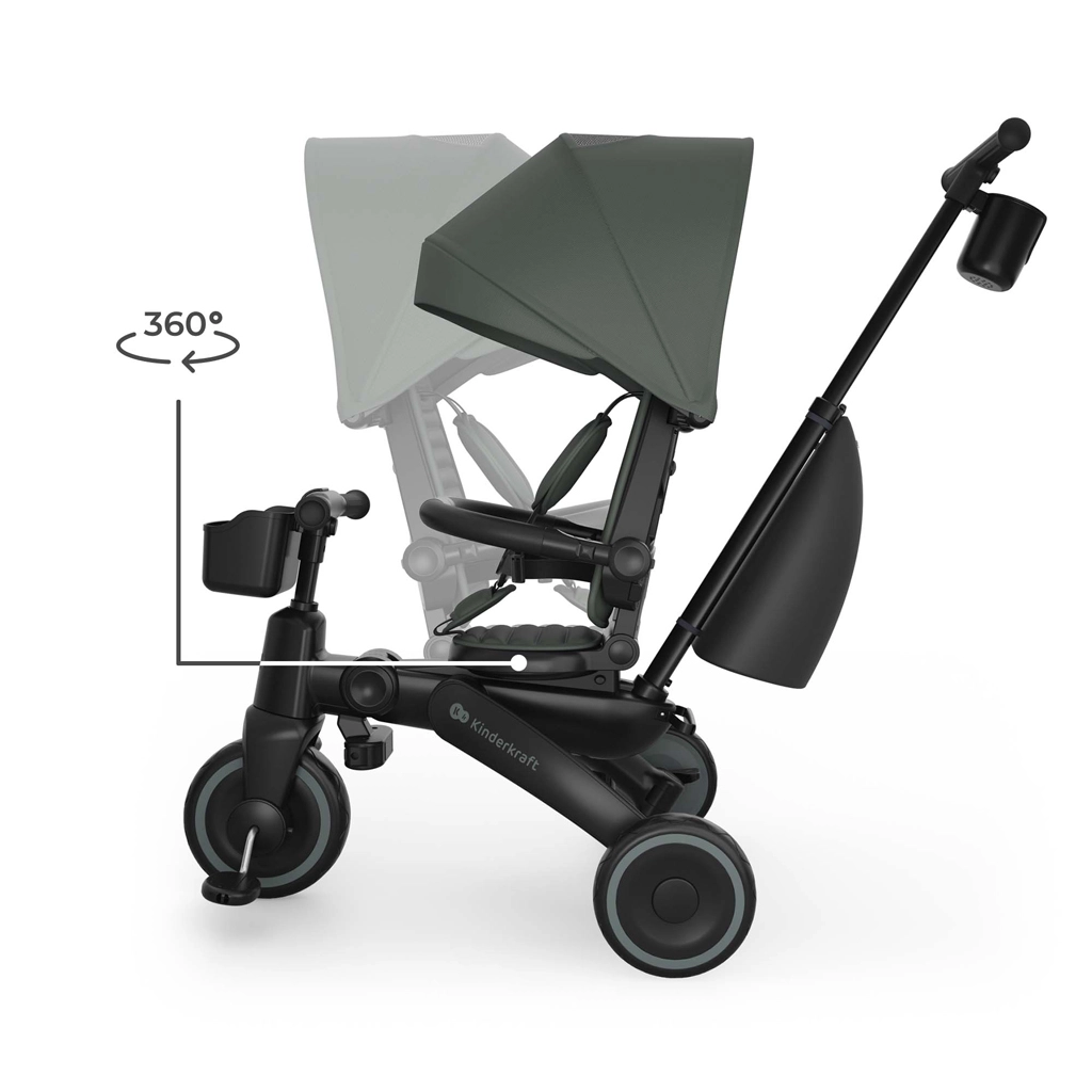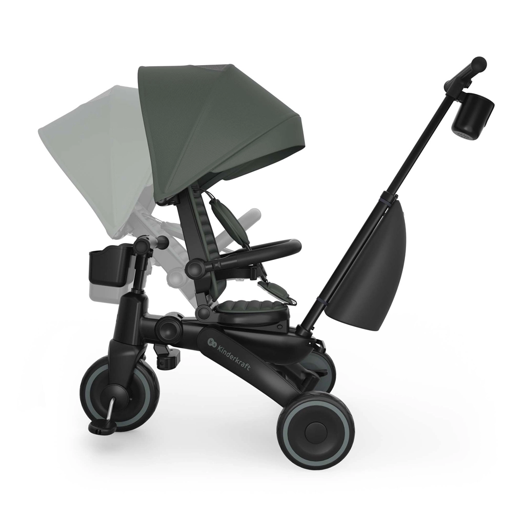 Zložljiv okvir z dvojno varovalno zaporo omogoča hitro in varno zlaganje v kompaktne mere. Tricikel lahko stabilno shranjujete v navpičnem ali vodoravnem položaju, kar pride prav v stanovanju, dvigalu ali prtljažniku avtomobila. Velika strešica s filtrom UPF 50+ in vodoodbojnim premazom ščiti pred soncem in rahlim dežjem, zračni panel in peek-a-boo okence pa izboljšata pretok zraka in stik z otrokom.