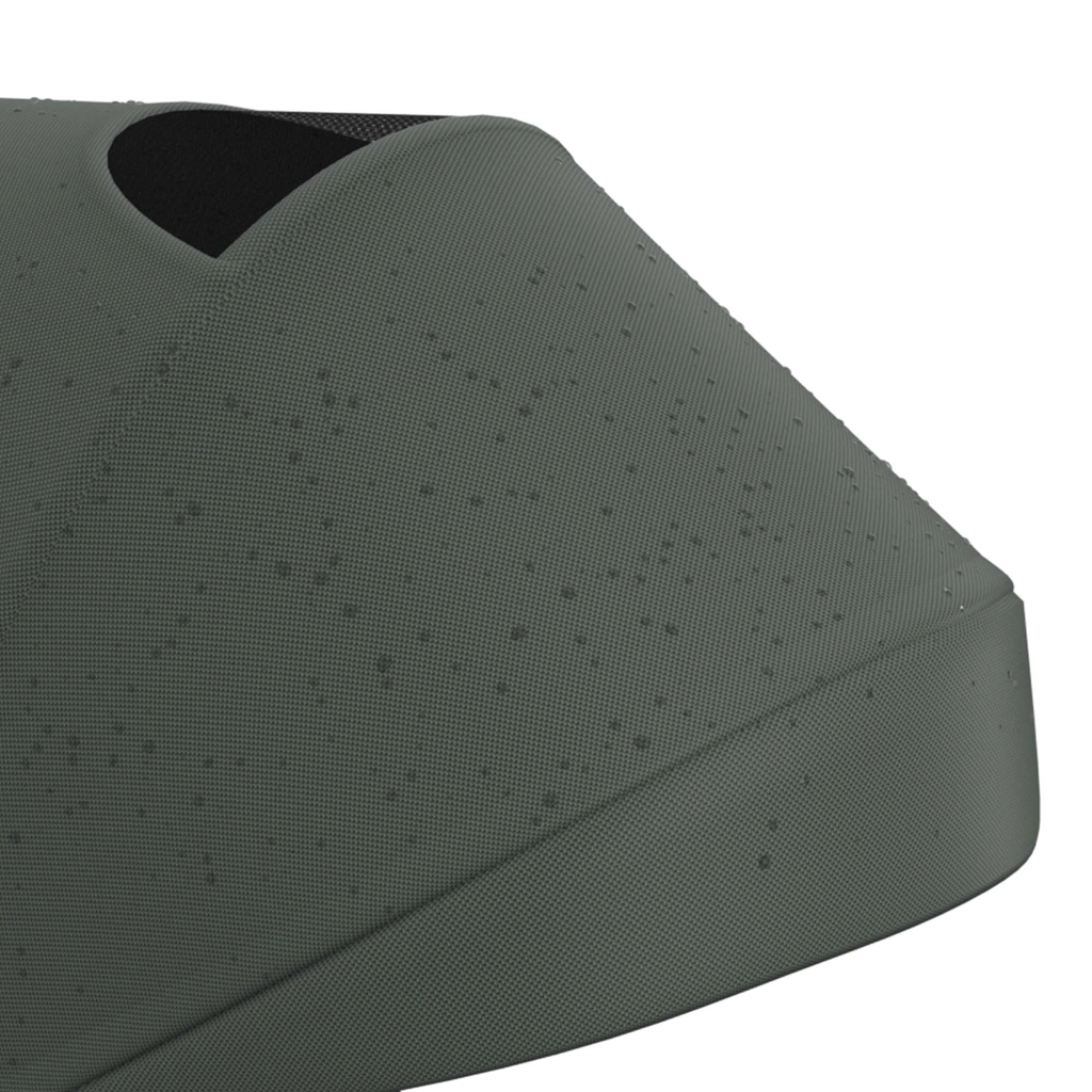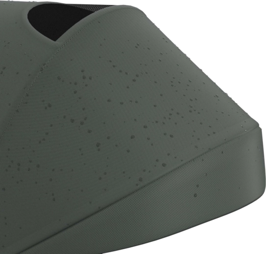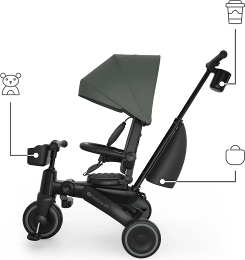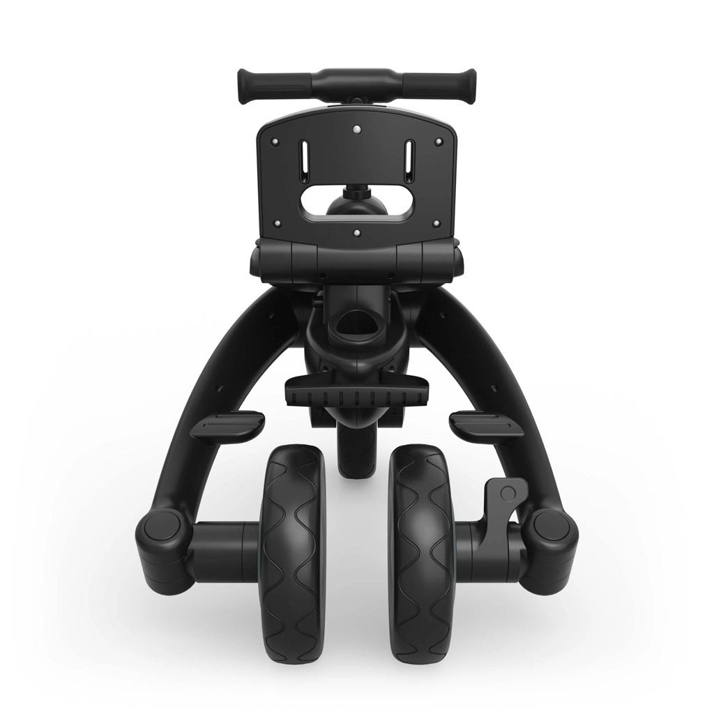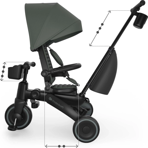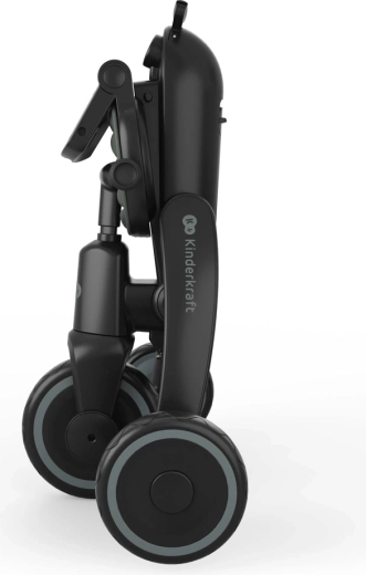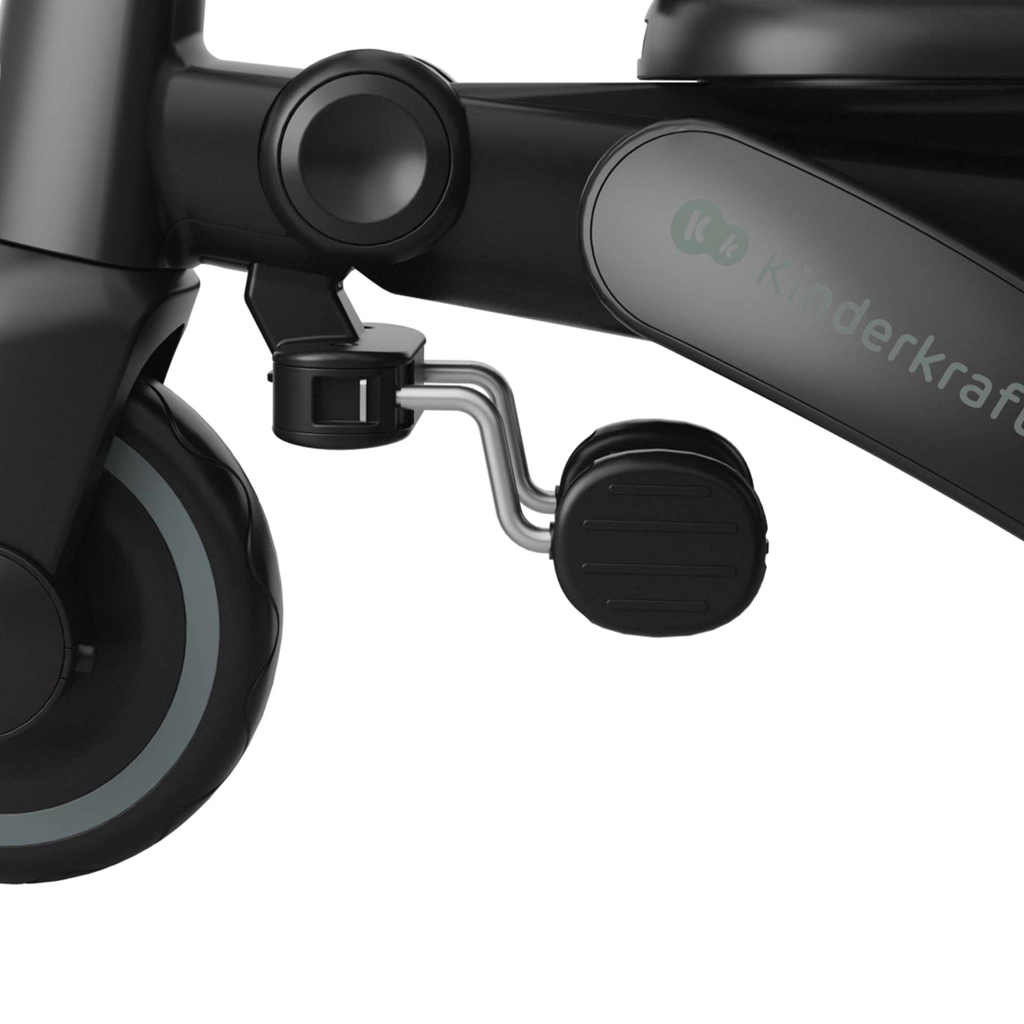 Zložljiv okvir z dvojno varovalno zaporo omogoča hitro in varno zlaganje v kompaktne mere. Tricikel lahko stabilno shranjujete v navpičnem ali vodoravnem položaju, kar pride prav v stanovanju, dvigalu ali prtljažniku avtomobila. Velika strešica s filtrom UPF 50+ in vodoodbojnim premazom ščiti pred soncem in rahlim dežjem, zračni panel in peek-a-boo okence pa izboljšata pretok zraka in stik z otrokom.